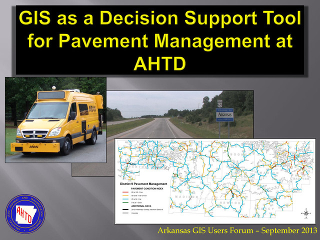 The Arkansas State Highway and Transportation Department AHTD maintains 16,000+ centerline miles of highways. Pavement condition is monitored by Automatic Road ANalyzer (ARAN) which collects International Roughness Index (IRI), Rutting, Right-Of-Way (ROW) images, pavement images (cracking) and other roadway data for every 5 meters in the network. This large amount of data, if not properly summarized and presented, will become a burden in terms of generating valuable information for decision making. This presentation demonstrates the power of GIS in supporting decision making by visualizing the data, identifying the needs, prioritizing the projects, and summarizing and comparing the regional performance. GIS also shows great advantages at integrating the pavement condition data with other layers of data in the department such as roadway network, construction and maintenance job records.