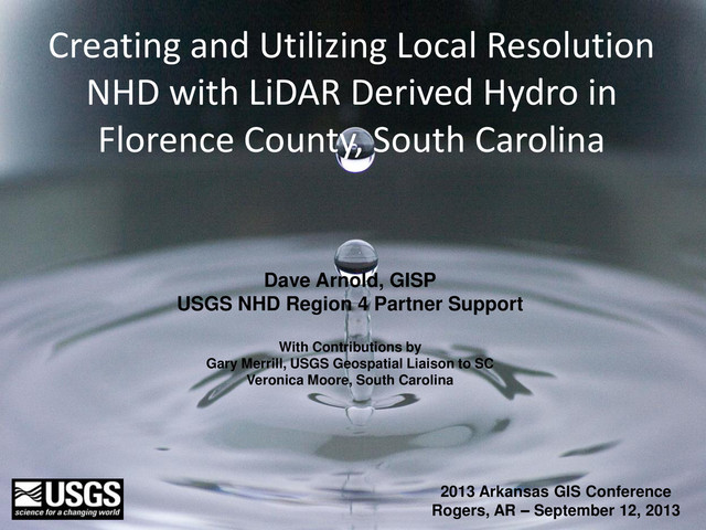 The National Hydrography Dataset (NHD) is a geodatabase representing surface water streams, water bodies, and a number of tables defining relationships and metadata. The hydrographic features are correlated with the certified Watershed Boundary Dataset (WBD). The NHD is maintained and updated via a stewardship process between the United States Geological Survey (USGS) and a principal steward in each state. The NHD was originally created at a scale of 1:100,000 and was later updated to 1:24,000 however, many states are now further increasing the scale, which is broadly defined as local resolution. To create local resolution NHD, Light Detection and Ranging (LiDAR) generated hydrographic break lines are becoming quite common. We will take a look at how state stewards are using LiDAR to update both the NHD and WBD, with a particular emphasis on a pilot project conducted in Florence County, South Carolina in early 2011.