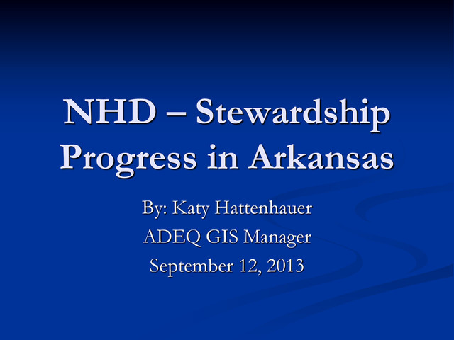 The Arkansas Department of Environmental Quality (ADEQ) officially accepted the role of the NHD Steward for the State of Arkansas on October 15, 2008. Since that time the AR Technical Working (TWG) has grown and continues to develop policies and instructions to make the NHD in AR more outstanding. The TWG has developed and attended meetings and trainings. A status map has been made to assist the TWG in their editing processes. An upcoming web edit tool, which will be disbursed for public use, will also aid the TWG in the editing process of the NHD. In 2013, in conjunction with the AGIO, ADEQ created an event dataset, which was added to the NHD to aid the “Tum Around, Don’t Drown” efforts. With all of these things combined, the TWG is moving forward to develop and maintain higher resolution NHD datasets across the state.