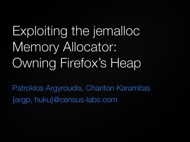 Census, Inc. (www.census-labs.com) Topics: kernel/heap exploitation, auditing Chariton Karamitas, huku Student at AUTh, intern at Census, Inc. Topics: compilers, heap exploitation, maths