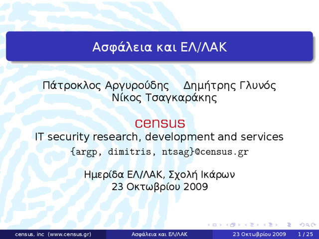 μηχανισμοί ελεγκτικής παρακολούθησης (auditing) Αντιπρόσωπος: συλλογή πληροφοριών από τη δικτυακή κίνηση ή από το ιστορικό ενός Η/Υ Αναλυτής: ανίχνευση επιθέσεων Αγγελιοφόρος: ειδοποίηση του διαχειριστή, λήψη αντιμέτρων OSSEC: ανάλυση αρχείων καταγραφής ιστορικού (iptables, OpenSSH, Samba, sendmail, Postfix, Apache, MySQL, PostgreSQL, MS IIS, ...), κεντρική διαχείριση Snort: ανάλυση δικτυακής κίνησης, ανίχνευση επιθέσεων μέσω των γνωστών χαρακτηριστικών τους, δυνατότητα λήψης αντιμέτρων (π.χ. σταματώντας πακέτα) Prelude: συλλογή πληροφοριών, συσχέτιση, αντιστοίχιση, συμβατό με σχεδόν όλα τα ΕΛ/ΛΑΚ συστήματα ανίχνευσης census, inc (www.census.gr) Ασφάλεια και ΕΛ/ΛΑΚ 23 Οκτωβρίου 2009 18 / 25