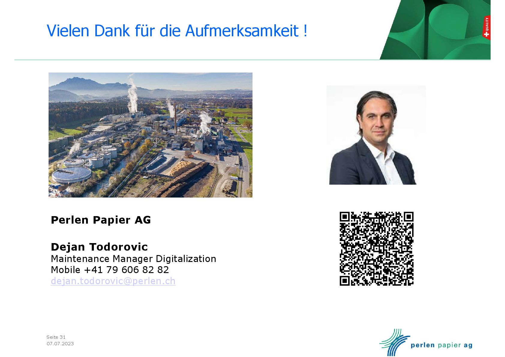 Kundenvortrag von Dejan Todorovic, Maintenance Manager Digitalization der Perlen Papier AG auf dem SAP EAM Kongress 2023 in Potsdam. Standard oder maßgeschneidertes SAP Maintenance Portal.