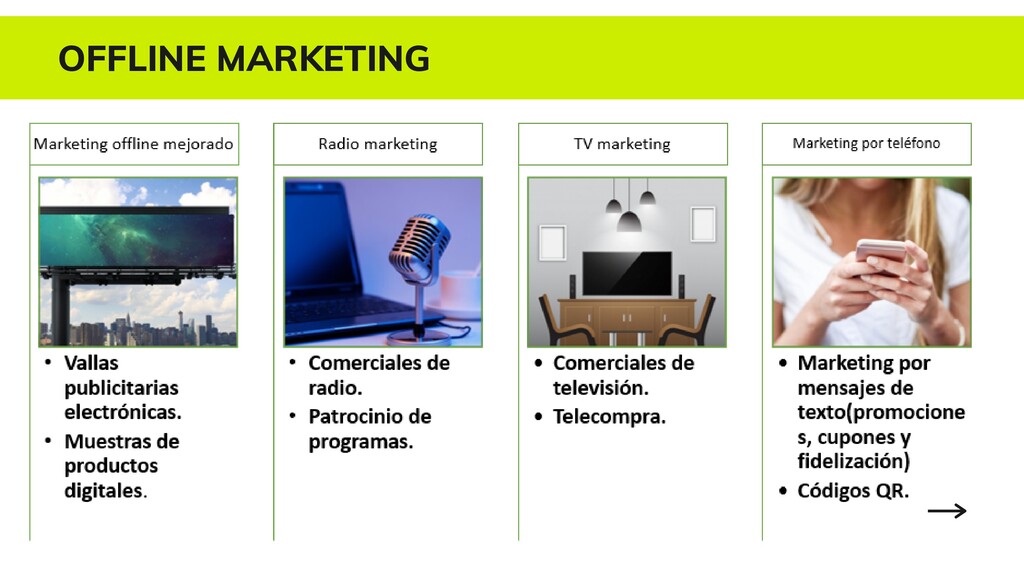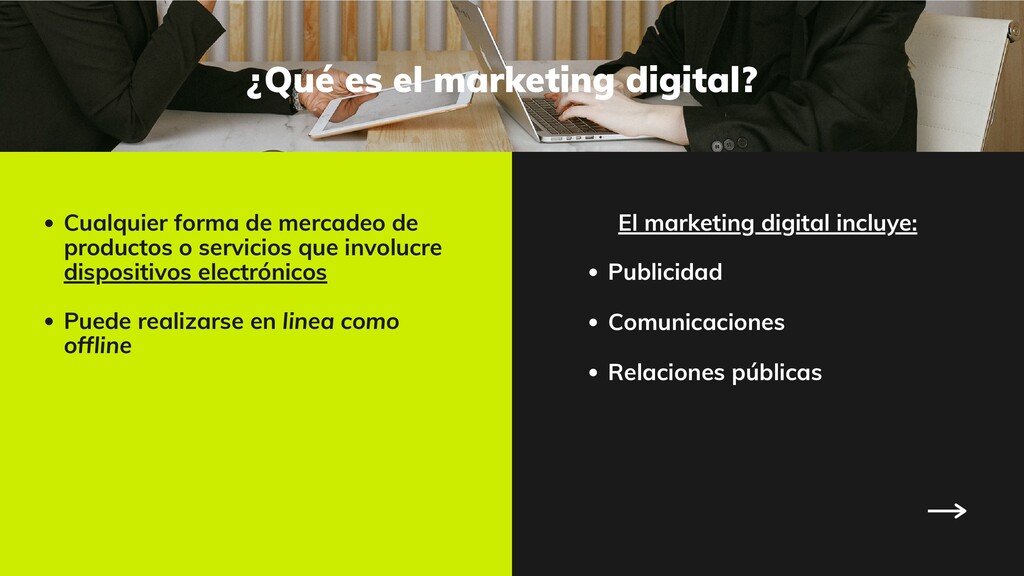 dispositivos electrónicos Puede realizarse en linea como offline Publicidad Comunicaciones Relaciones públicas El marketing digital incluye: ¿Qué es el marketing digital?