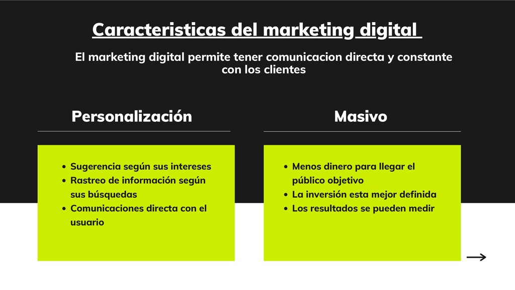 de información según sus búsquedas Comunicaciones directa con el usuario Menos dinero para llegar el público objetivo La inversión esta mejor definida Los resultados se pueden medir Masivo El marketing digital permite tener comunicacion directa y constante con los clientes