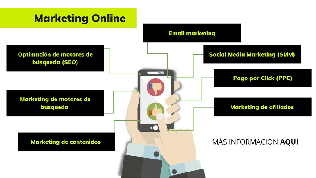Marketing de contenidos Email marketing Optimación de motores de búsqueda (SEO) Marketing de motores de busqueda Marketing de afiliados MÁS INFORMACIÓN AQUI
