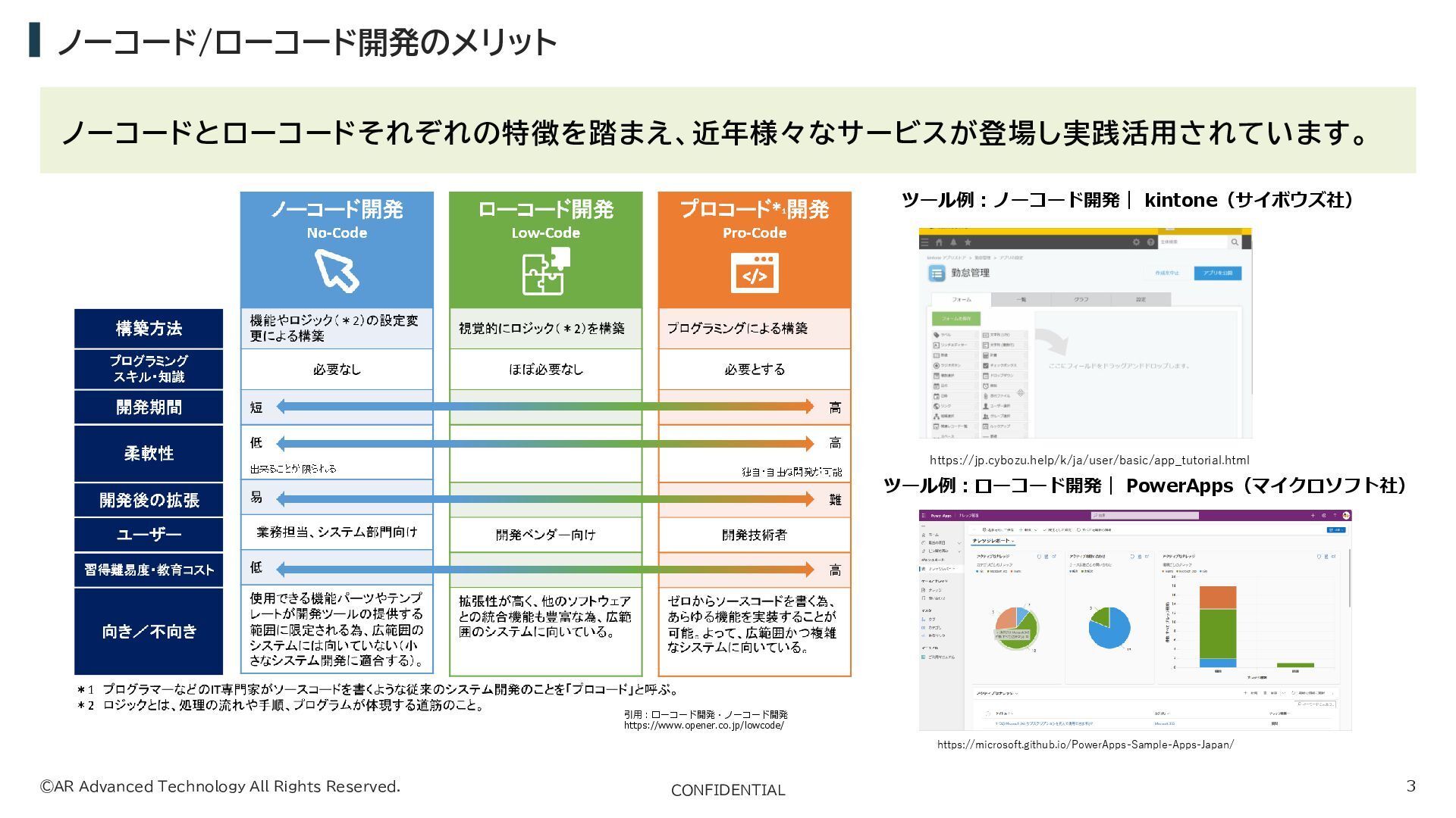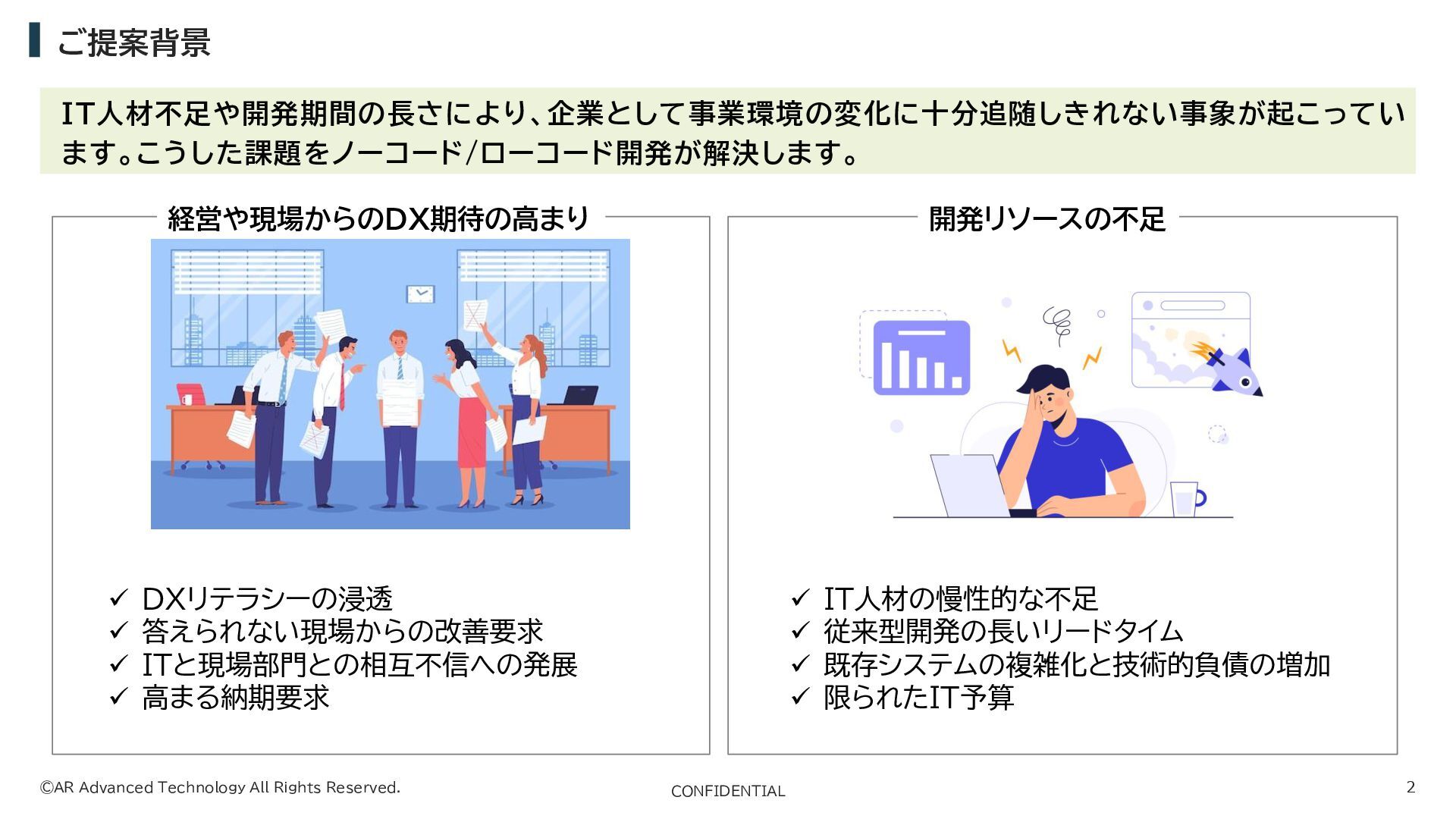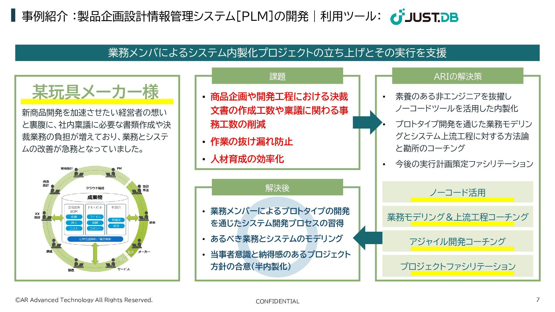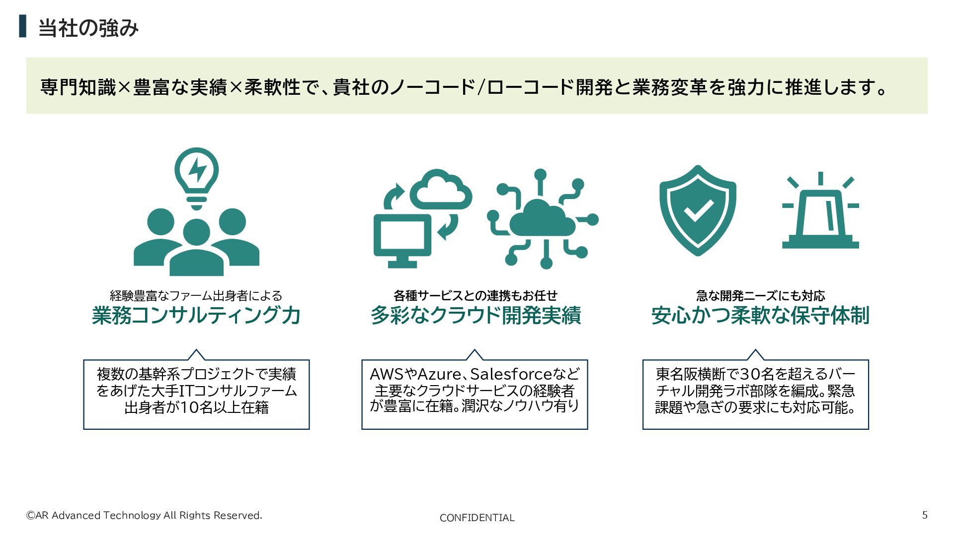 製品選定でお悩みの場合も是非ご相談ください。 ノーコード ローコード • 申請承認システム[ワークフロー](サービス業) • 営業支援&案件管理システム[SFA](SIer) • 製品企画設計情報管理システム[PLM](製造業) • 稟議書の電子化対応[ワークフロー](商社) • 債権管理システム(社会インフラ) • 設備管理システム(製造業) • 申請管理システム(製造業) • システム構成管理ポータル(製造業) • 管理会計システム(商社) 製品/プラットフォーム 弊社での主な実績 ※こちらにないソリューションに関しても対応可能な場合があります。遠慮なくご相談ください。 特徴(弊社見解) サイボウズ提供のクラウド型業務ア プリ作成プラットフォーム。TV-CM の効果もあり利用企業多い。 ジャストシステム社のデータベース 管理システム。同時ログイン者数ラ イセンスなど独自の特徴あり。 エンタープライズ向け統合型ロー コードプラットフォーム。ワークフ ローに強い。 (サイボウズ) (ジャストシステム) (エヌ・ティ・ティ・データイントラマート) PLM製品であるTeamcenter、 SAP、Salesforceなどエンタープ ライズ製品との連携に強み。 (シーメンス) (マイクロソフト) ローコード開発ツール群で、アプリ 作成、ワークフロー自動化、データ 分析など広範に対応可能。