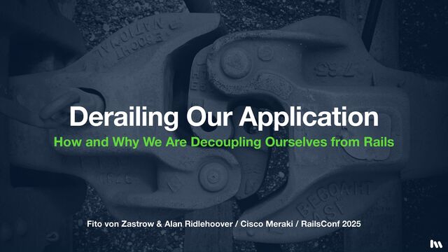 Cisco is probably the largest Rails shop you’ve never heard of. Our 4 million line Ruby codebase has been under continuous development since 2006. As with any large codebase, ours is not without challenges. In “Derailing Our Application,” we share how our architecture has evolved to decouple 800,000 lines of Ruby code from Rails constructs in order to enable us to scale our team to 1,000 engineers and beyond without losing the benefits of Rails. Join us on the track less traveled! All aboard!