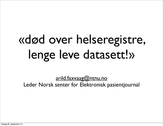 helseopplysninger for å yte helsehjelp til den helseopplysningene handler om – (pasientjournalloven) – interessenter: pasienten og helsehjelperne • sekundær: all annen sammenstilling og bruk av de samme opplysningene – (helseregisterloven) – interessenter: myndigheter, ledere, forskere, tilsynsmyndigheter, epidemiologer, spesialistforeninger, farmasøytisk industri, pasientforeninger 3 fredag 26. september 14