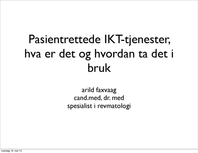 ikke lenger mulig å basere en virksomhet på at den har ekskusiv tilgang til en kunnskapsbase • pasientene våre har i dag tilgang til den samme kunnskapen som oss • dette utfordrer kjerneverdiene våre • hva er det egentlig vi kan, og hvordan kan bruken av vår kompetanse skape verdier for pasienten? • hvordan kan vi utnytte at det er nett overalt og at alt kommer på nett? bakgrunn og motivasjon (2) mandag 19. mai 14