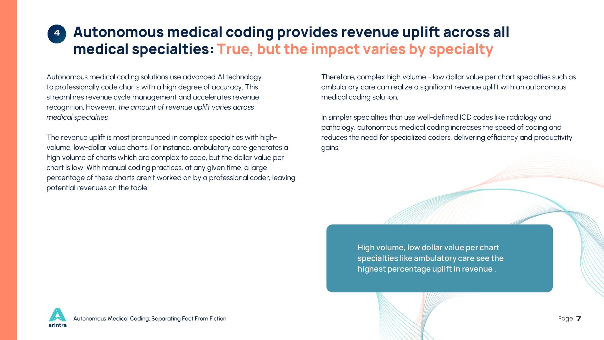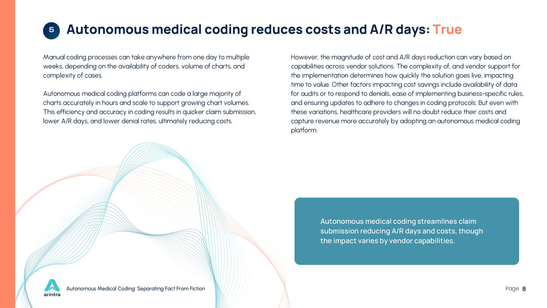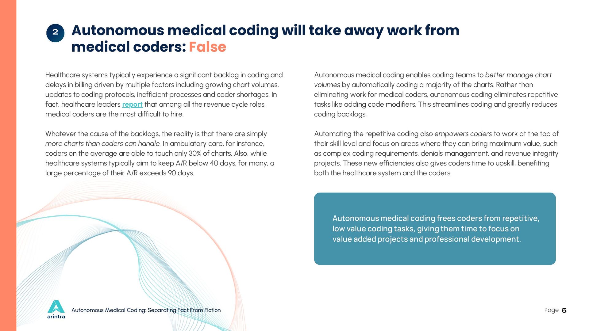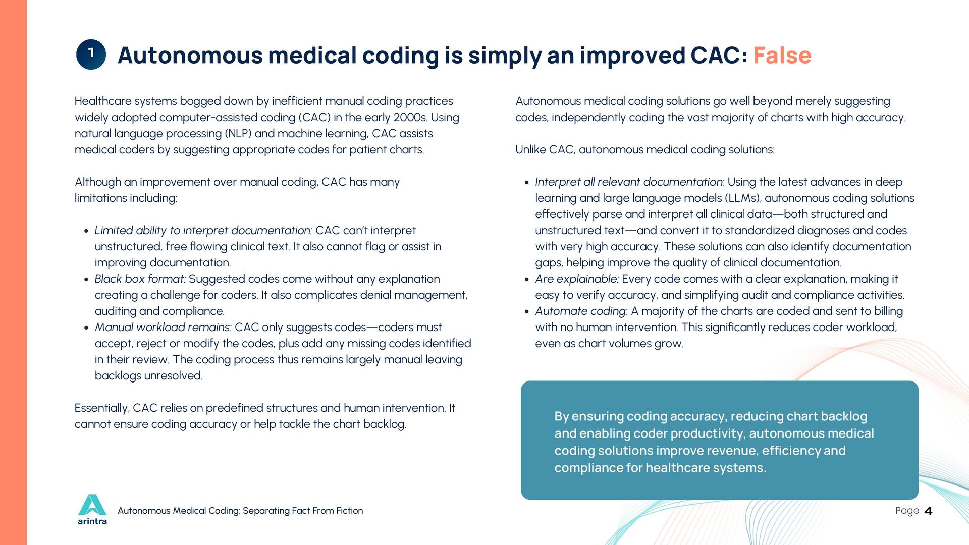 Healthcare systems bogged down by inefficient manual coding practices widely adopted computer-assisted coding (CAC) in the early 2000s. Using natural language processing (NLP) and machine learning, CAC assists medical coders by suggesting appropriate codes for patient charts. Although an improvement over manual coding, CAC has many limitations including: Limited ability to interpret documentation: CAC can’t interpret unstructured, free flowing clinical text. It also cannot flag or assist in improving documentation. Black box format: Suggested codes come without any explanation creating a challenge for coders. It also complicates denial management, auditing and compliance. Manual workload remains: CAC only suggests codes—coders must accept, reject or modify the codes, plus add any missing codes identified in their review. The coding process thus remains largely manual leaving backlogs unresolved. Essentially, CAC relies on predefined structures and human intervention. It cannot ensure coding accuracy or help tackle the chart backlog. Autonomous medical coding solutions go well beyond merely suggesting codes, independently coding the vast majority of charts with high accuracy. Unlike CAC, autonomous medical coding solutions: Interpret all relevant documentation: Using the latest advances in deep learning and large language models (LLMs), autonomous coding solutions effectively parse and interpret all clinical data—both structured and unstructured text—and convert it to standardized diagnoses and codes with very high accuracy. These solutions can also identify documentation gaps, helping improve the quality of clinical documentation. Are explainable: Every code comes with a clear explanation, making it easy to verify accuracy, and simplifying audit and compliance activities. Automate coding: A majority of the charts are coded and sent to billing with no human intervention. This significantly reduces coder workload, even as chart volumes grow. 4 Page By ensuring coding accuracy, reducing chart backlog and enabling coder productivity, autonomous medical coding solutions improve revenue, efficiency and compliance for healthcare systems. Autonomous Medical Coding: Separating Fact From Fiction