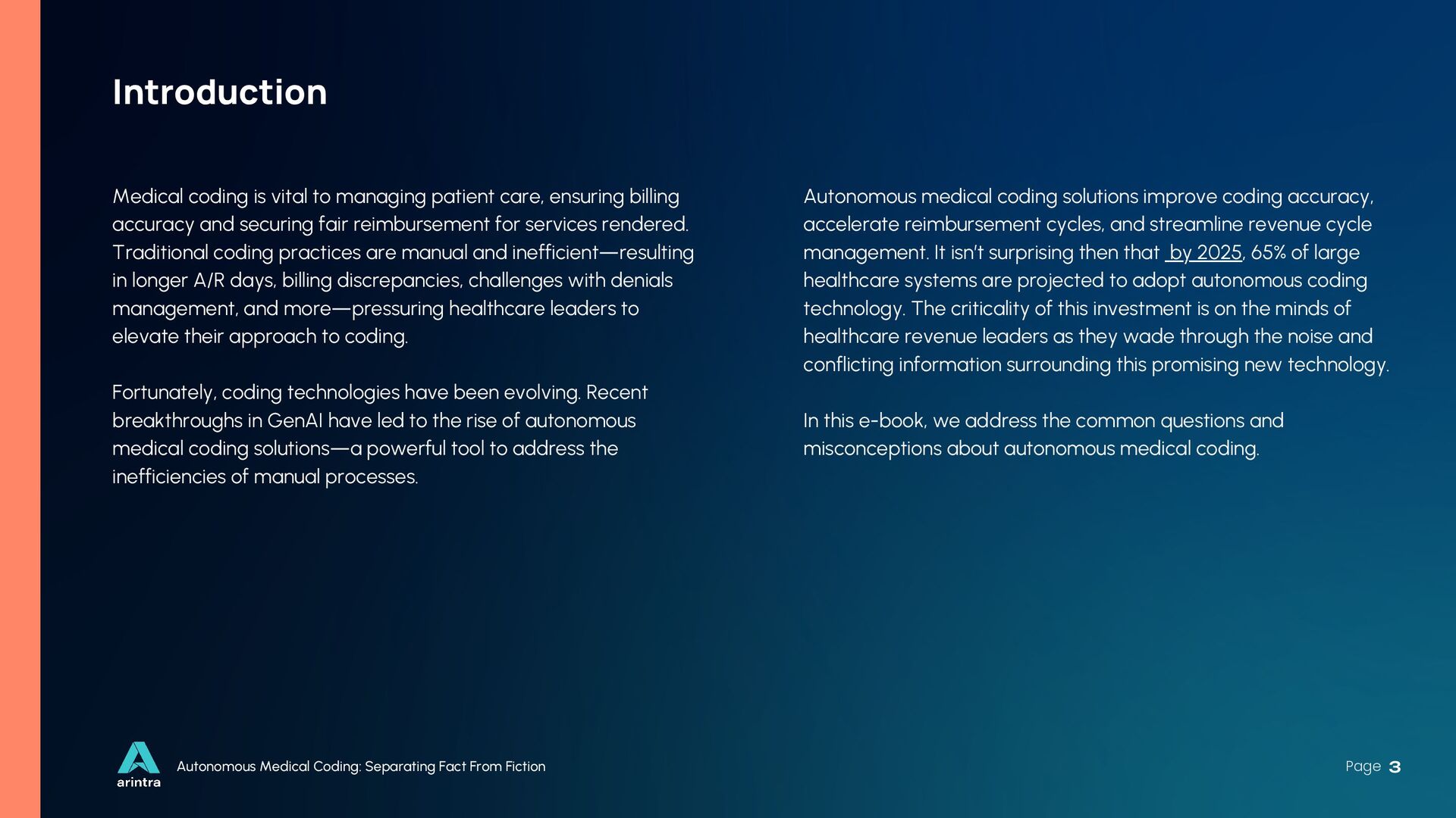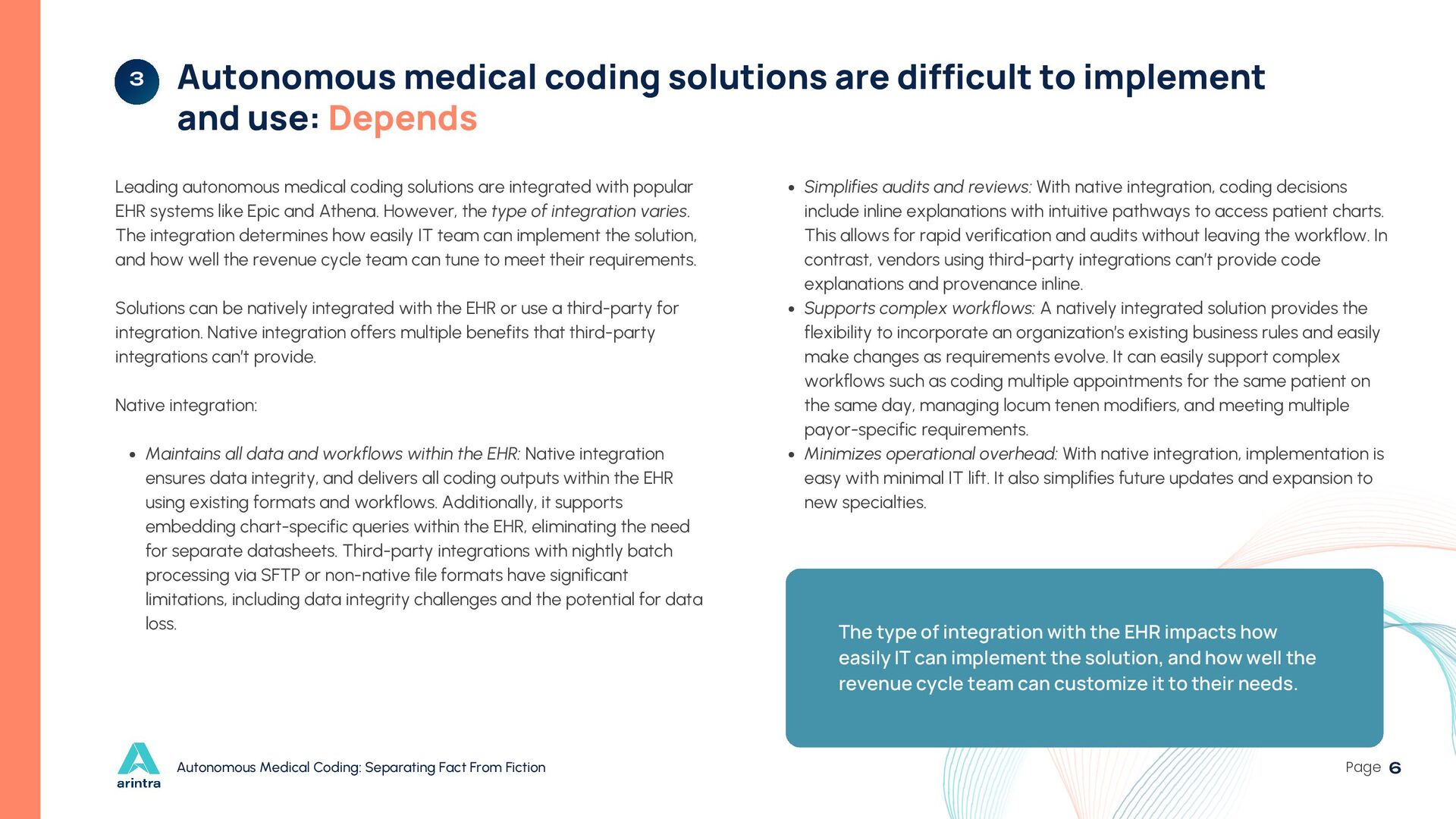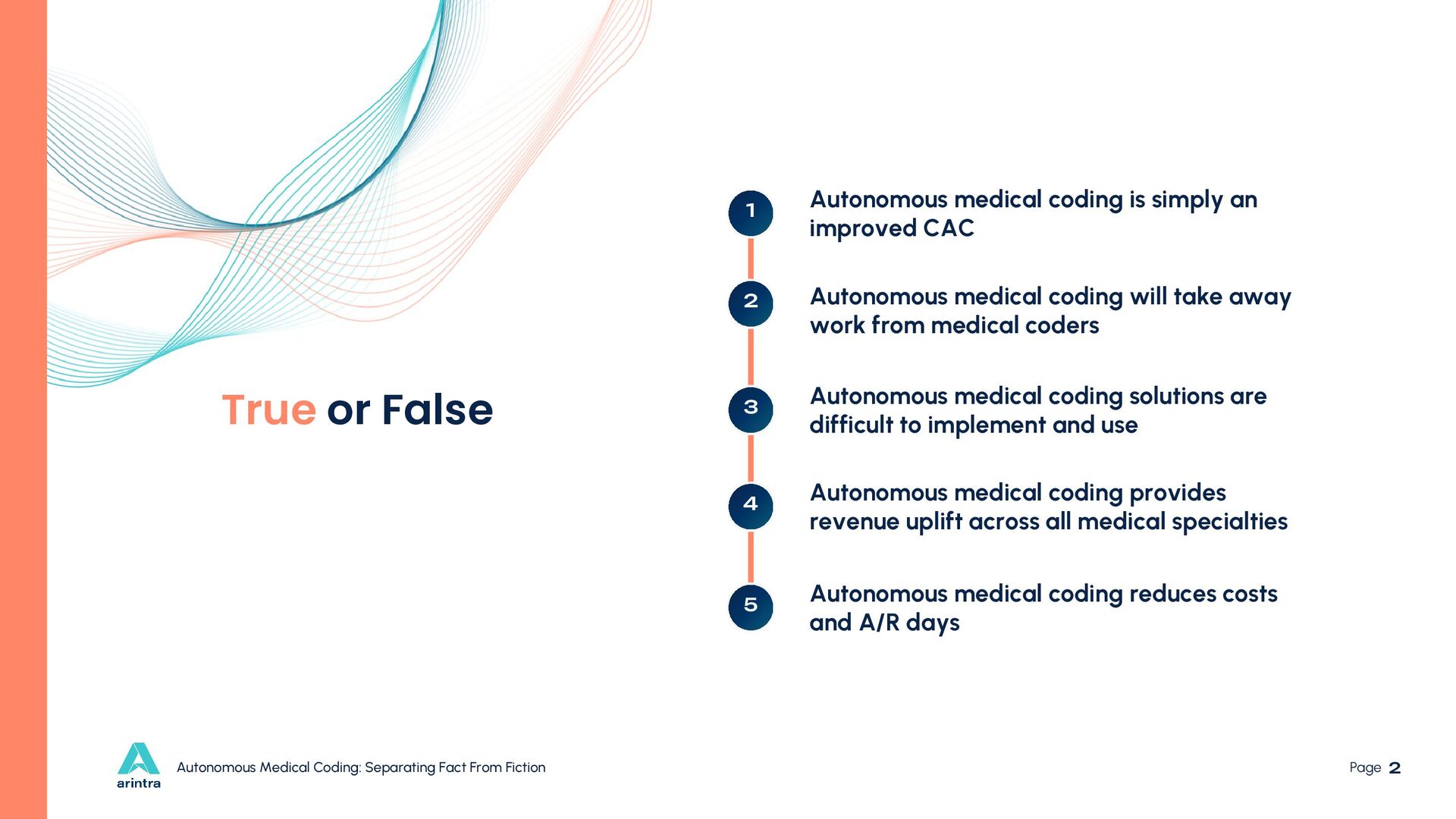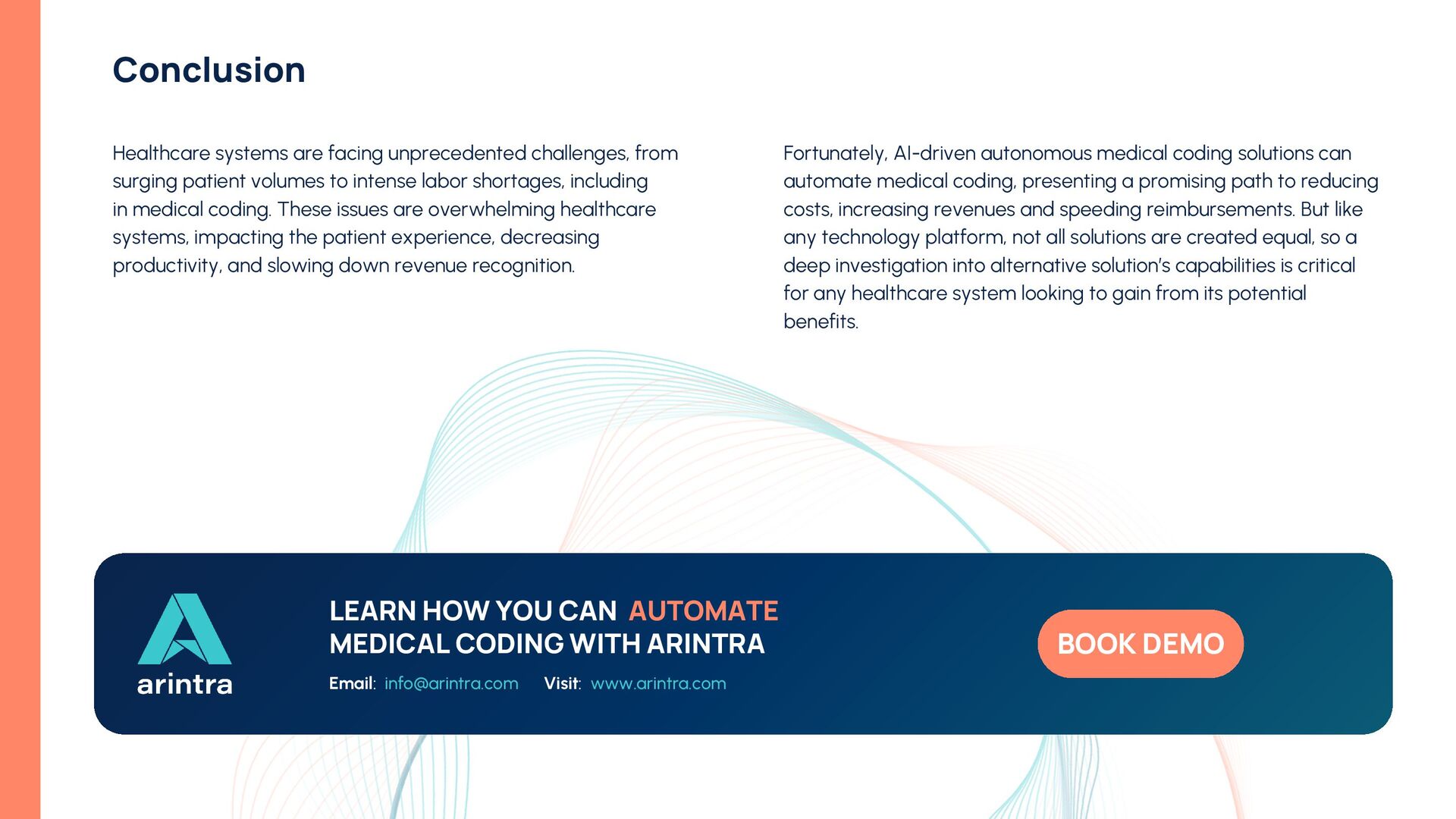 Healthcare systems bogged down by inefficient manual coding practices widely adopted computer-assisted coding (CAC) in the early 2000s. Using natural language processing (NLP) and machine learning, CAC assists medical coders by suggesting appropriate codes for patient charts. Although an improvement over manual coding, CAC has many limitations including: Limited ability to interpret documentation: CAC can’t interpret unstructured, free flowing clinical text. It also cannot flag or assist in improving documentation. Black box format: Suggested codes come without any explanation creating a challenge for coders. It also complicates denial management, auditing and compliance. Manual workload remains: CAC only suggests codes—coders must accept, reject or modify the codes, plus add any missing codes identified in their review. The coding process thus remains largely manual leaving backlogs unresolved. Essentially, CAC relies on predefined structures and human intervention. It cannot ensure coding accuracy or help tackle the chart backlog. Autonomous medical coding solutions go well beyond merely suggesting codes, independently coding the vast majority of charts with high accuracy. Unlike CAC, autonomous medical coding solutions: Interpret all relevant documentation: Using the latest advances in deep learning and large language models (LLMs), autonomous coding solutions effectively parse and interpret all clinical data—both structured and unstructured text—and convert it to standardized diagnoses and codes with very high accuracy. These solutions can also identify documentation gaps, helping improve the quality of clinical documentation. Are explainable: Every code comes with a clear explanation, making it easy to verify accuracy, and simplifying audit and compliance activities. Automate coding: A majority of the charts are coded and sent to billing with no human intervention. This significantly reduces coder workload, even as chart volumes grow. 4 Page By ensuring coding accuracy, reducing chart backlog and enabling coder productivity, autonomous medical coding solutions improve revenue, efficiency and compliance for healthcare systems. Autonomous Medical Coding: Separating Fact From Fiction