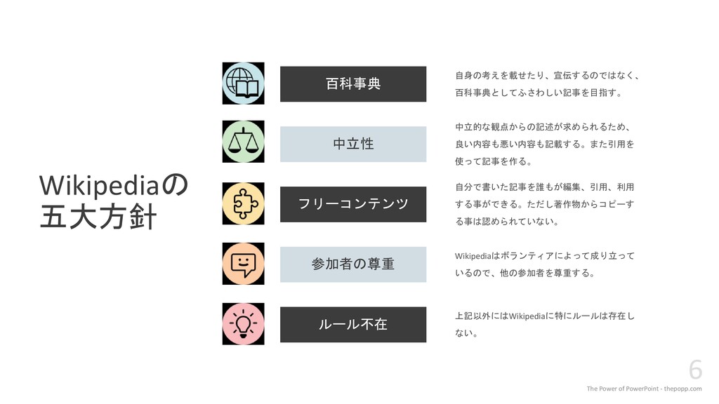 The Power of PowerPoint - thepopp.com 6 百科事典 自身の考えを載せたり、宣伝するのではなく、 百科事典としてふさわしい記事を目指す。