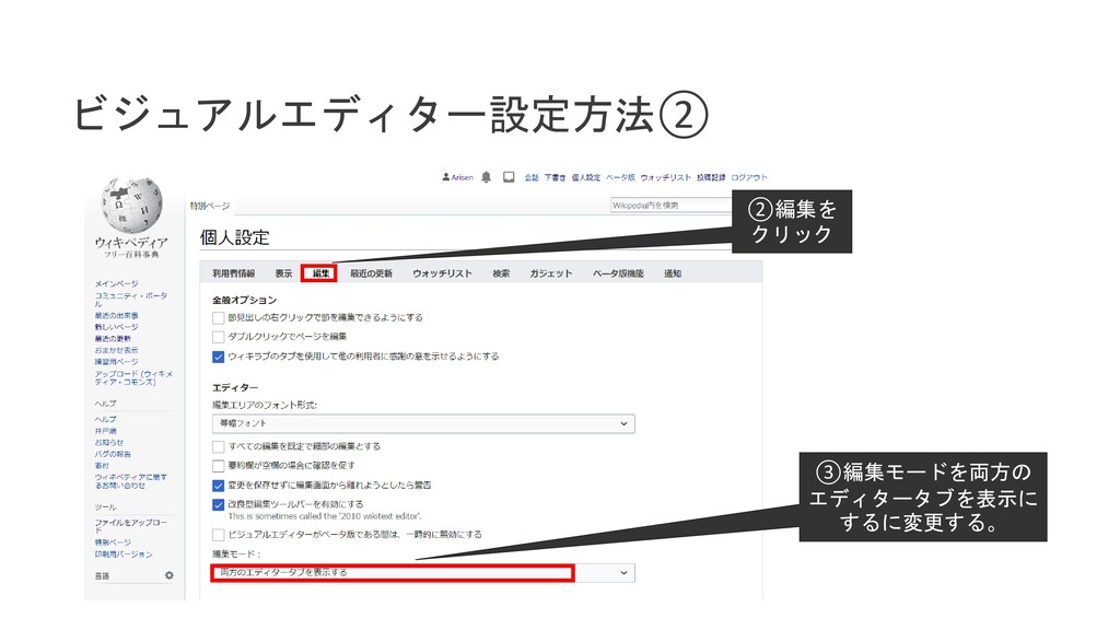 ②編集を クリック ③編集モードを両方の エディタータブを表示に するに変更する。 ビジュアルエディター設定方法②