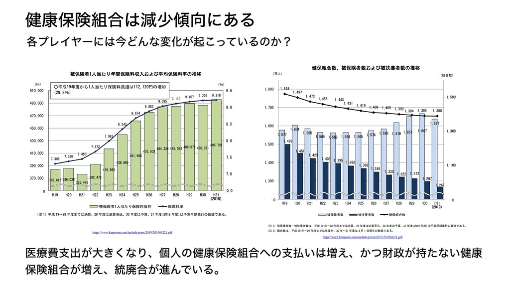 ݈߁อݥ߹ݮগʹ͋Δ ֤ϓϨΠϠʔʹࠓͲΜͳมԽ͕ى͍ͬͯ͜Δͷ͔ʁ ҩྍඅࢧग़͕େ͖͘ͳΓɺݸਓͷ݈߁อݥ߹ͷࢧ͍૿͑ɺ͔ͭࡒ͕࣋ͨͳ͍݈߁ อݥ߹͕૿͑ɺ౷ഇ߹͕ਐΜͰ͍Δɻ https://www.kenporen.com/include/press/2019/201904221.pdf https://www.kenporen.com/include/press/2019/201904221.pdf