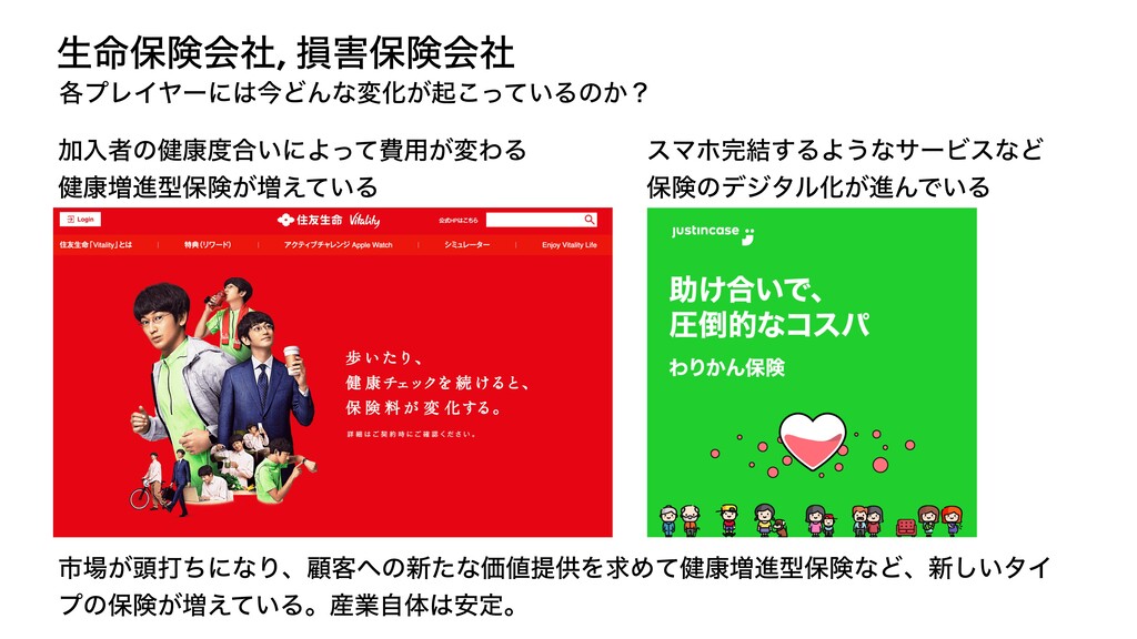 ੜ໋อݥձࣾ, ଛอݥձࣾ ֤ϓϨΠϠʔʹࠓͲΜͳมԽ͕ى͍ͬͯ͜Δͷ͔ʁ Ճೖऀͷ݈߁߹͍ʹΑͬͯඅ༻͕มΘΔ ݈߁૿ਐܕอݥ͕૿͍͑ͯΔ εϚϗ݁͢ΔΑ͏ͳαʔϏεͳͲ อݥͷσδλϧԽ͕ਐΜͰ͍Δ ࢢ͕಄ଧͪʹͳΓɺސ٬ͷ৽ͨͳՁఏڙΛٻΊ݈ͯ߁૿ਐܕอݥͳͲɺ৽͍͠λΠ ϓͷอݥ͕૿͍͑ͯΔɻ࢈ۀࣗମ҆ఆɻ