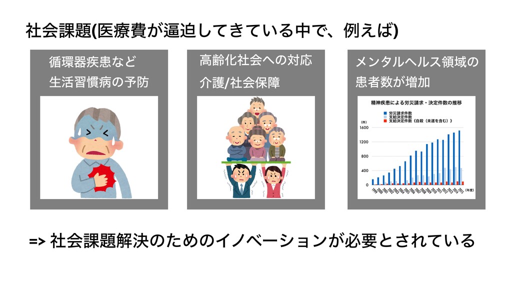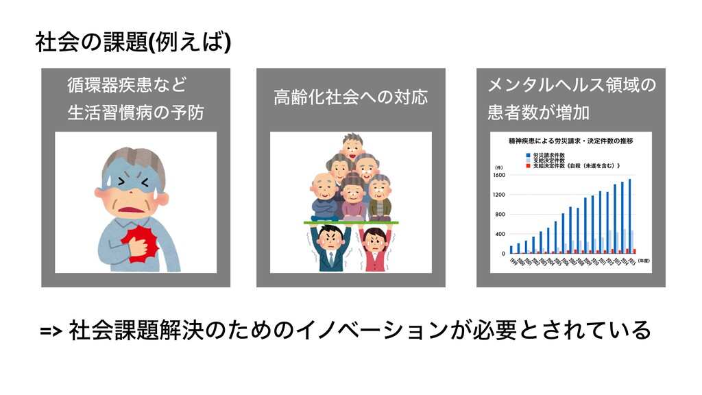 ࣾձͷ՝(ྫ͑) ॥ث࣬ױͳͲ ੜ׆श׳පͷ༧ ߴྸԽࣾձͷରԠ ϝϯλϧϔϧεྖҬͷ ױऀ͕૿Ճ => ࣾձ՝ղܾͷͨΊͷΠϊϕʔγϣϯ͕ඞཁͱ͞Ε͍ͯΔ