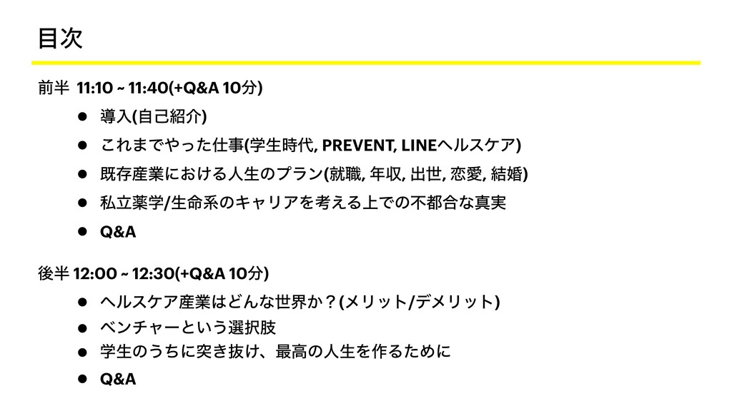 PREVENT, LINEϔϧεέΞ) • طଘ࢈ۀʹ͓͚Δਓੜͷϓϥϯ(ब৬, ऩ, ग़ੈ, ࿀Ѫ, ݁ࠗ) • ࢲཱༀֶ/ੜ໋ܥͷΩϟϦΞΛߟ͑Δ্Ͱͷෆ߹ͳਅ࣮ • Q&A ޙ 12:00 ~ 12:30(+Q&A 10) • ϔϧεέΞ࢈ۀͲΜͳੈք͔ʁ(ϝϦοτ/σϝϦοτ) • ϕϯνϟʔͱ͍͏બࢶ • ֶੜͷ͏ͪʹಥ͖ൈ͚ɺ࠷ߴͷਓੜΛ࡞ΔͨΊʹ • Q&A