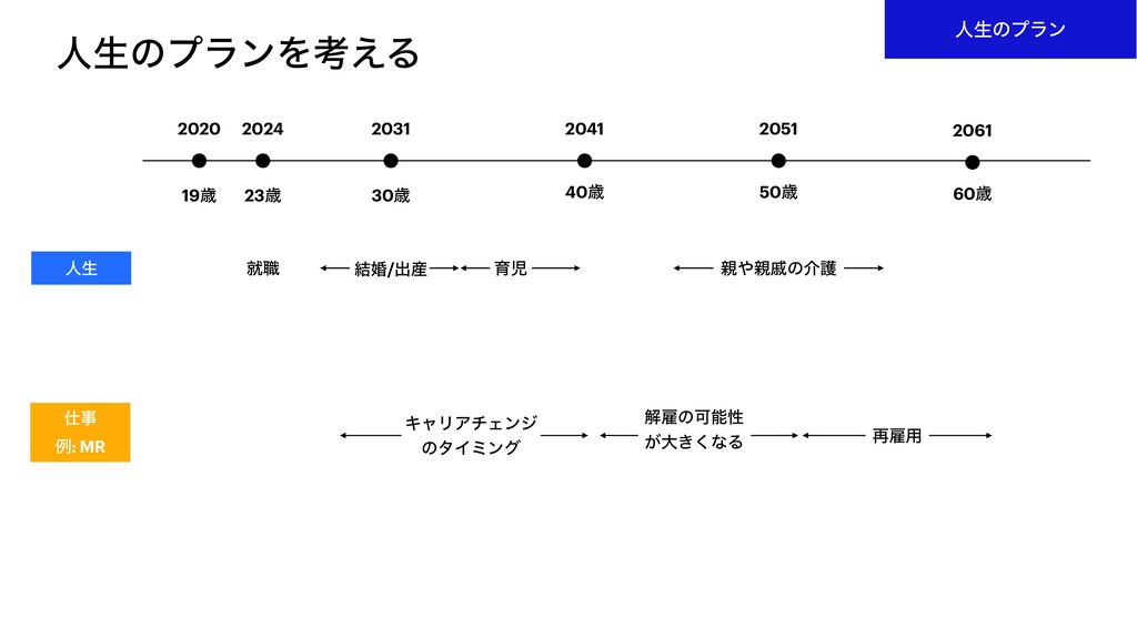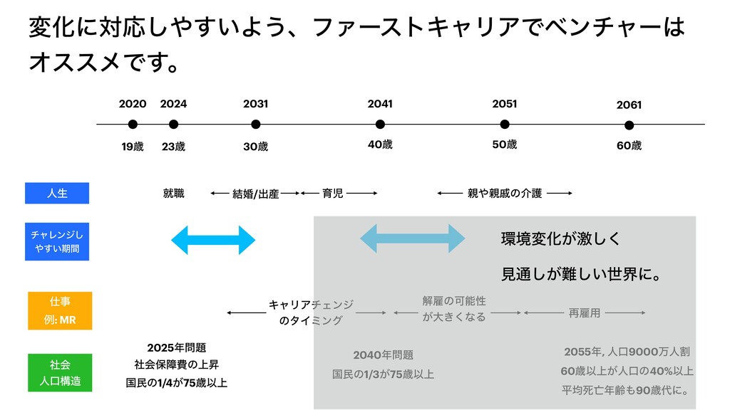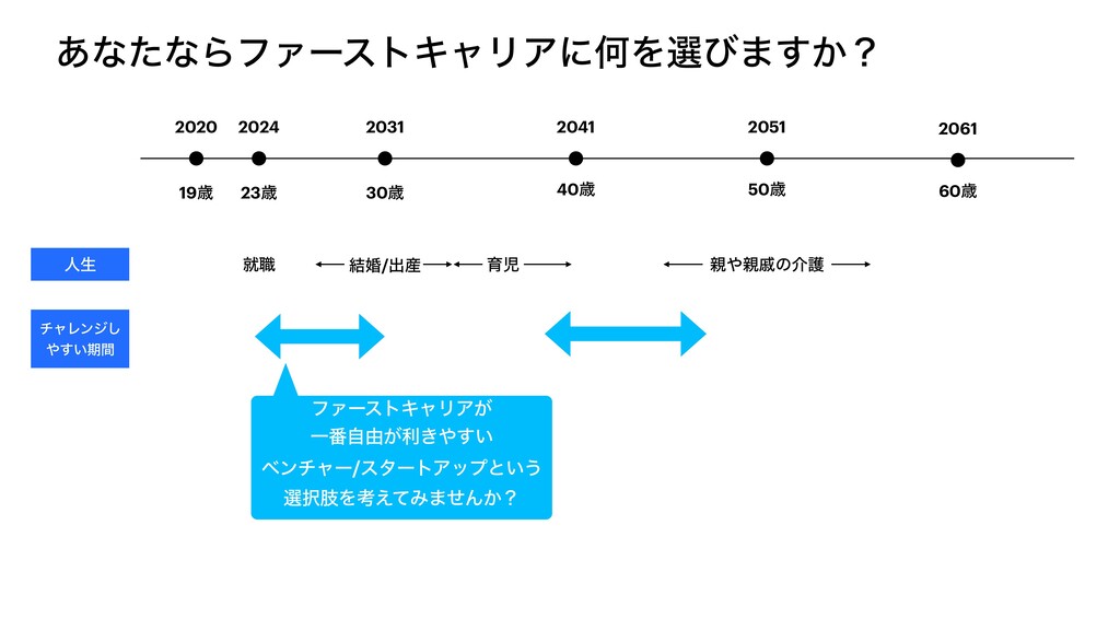 2051 60ࡀ 2061 ਓੜ ब৬ ݁ࠗ/ग़࢈ ҭࣇ ੰͷհޢ νϟϨϯδ͠ ͍͢ظؒ ϑΝʔετΩϟϦΞ͕ Ұ൪ࣗ༝͕ར͖͍͢ ϕϯνϟʔ/ελʔτΞοϓͱ͍͏ બࢶΛߟ͑ͯΈ·ͤΜ͔ʁ