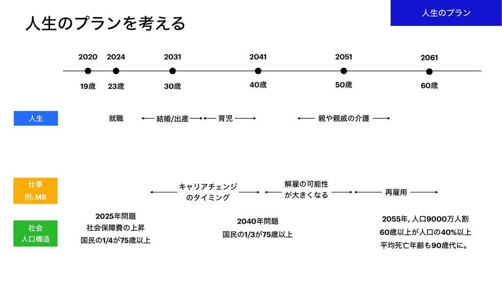 50ࡀ 2051 60ࡀ 2061 ਓੜ ब৬ ݁ࠗ/ग़࢈ ҭࣇ ੰͷհޢ ࣄ ྫ: MR ΩϟϦΞνΣϯδ ͷλΠϛϯά ղޏͷՄೳੑ ͕େ͖͘ͳΔ ࠶ޏ༻ ࣾձ ਓޱߏ 2025 ࣾձอোඅͷ্ঢ ࠃຽͷ1/4͕75ࡀҎ্ 2055, ਓޱ9000ສਓׂ 60ࡀҎ্͕ਓޱͷ40%Ҏ্ ฏۉࢮྸ90ࡀʹɻ 2040 ࠃຽͷ1/3͕75ࡀҎ্ νϟϨϯδ͠ ͍͢ظؒ ڥมԽ͕ܹ͘͠ ݟ௨͕͍͠͠ੈքʹɻ