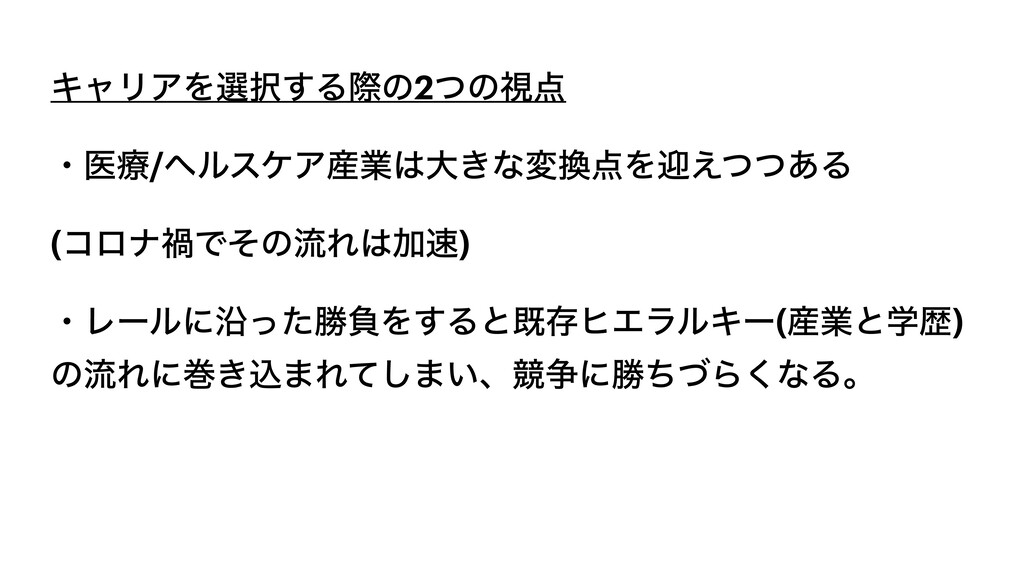 ΩϟϦΞΛબ͢Δࡍͷ2ͭͷࢹ ɾҩྍ/ϔϧεέΞ࢈ۀେ͖ͳมΛܴ͑ͭͭ͋Δ (ίϩφՒͰͦͷྲྀΕՃ) ɾϨʔϧʹԊͬͨউෛΛ͢ΔͱطଘώΤϥϧΩʔ(࢈ۀͱֶྺ) ͷྲྀΕʹר͖ࠐ·Εͯ͠·͍ɺڝ૪ʹউͪͮΒ͘ͳΔɻ