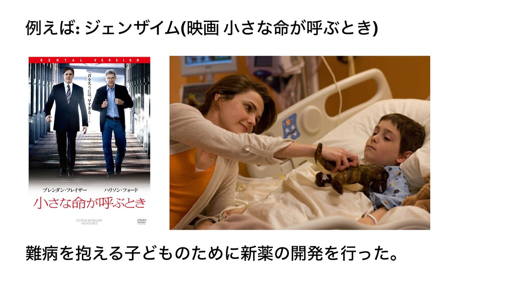 ྫ͑: δΣϯβΠϜ(өը খ͞ͳ໋͕ݺͿͱ͖) පΛ๊͑ΔࢠͲͷͨΊʹ৽ༀͷ։ൃΛߦͬͨɻ