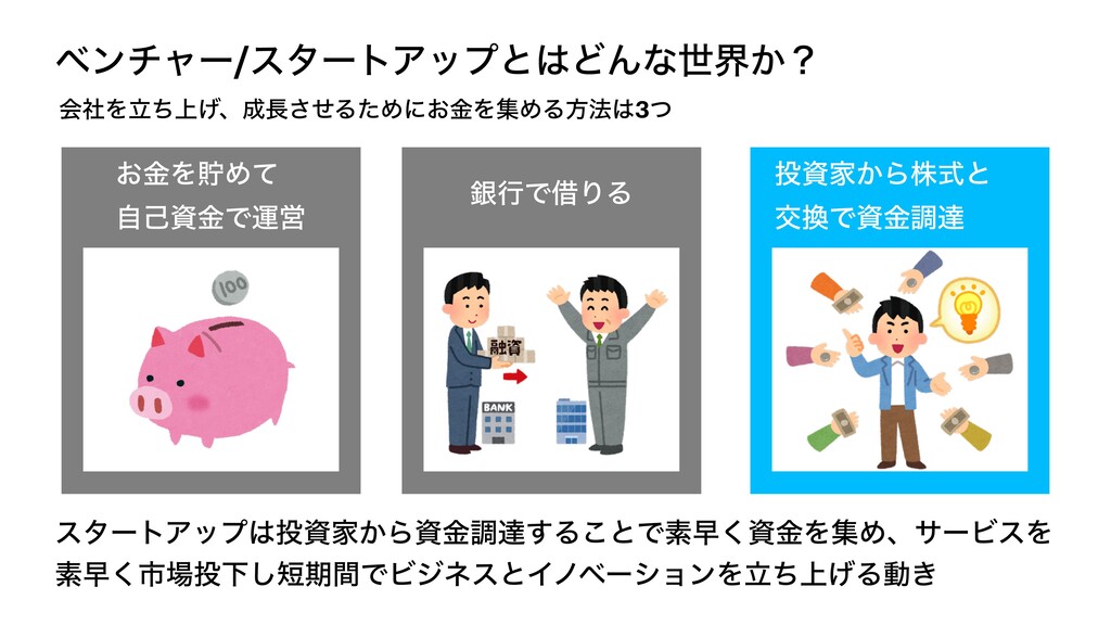 ϕϯνϟʔ/ελʔτΞοϓͱͲΜͳੈք͔ʁ ձࣾΛ্ཱͪ͛ɺͤ͞ΔͨΊʹ͓ۚΛूΊΔํ๏3ͭ ͓ۚΛஷΊͯ ࣗݾࢿۚͰӡӦ ۜߦͰआΓΔ ࢿՈ͔Βגࣜͱ ަͰࢿۚௐୡ ελʔτΞοϓࢿՈ͔Βࢿۚௐୡ͢Δ͜ͱͰૉૣ͘ࢿۚΛूΊɺαʔϏεΛ ૉૣ͘ࢢԼ͠ظؒͰϏδωεͱΠϊϕʔγϣϯΛ্ཱͪ͛Δಈ͖