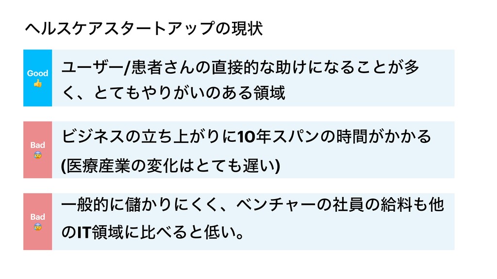 ϔϧεέΞελʔτΞοϓͷݱঢ় Good Ϣʔβʔ/ױऀ͞Μͷతͳॿ͚ʹͳΔ͜ͱ͕ଟ ͘ɺͱͯΓ͕͍ͷ͋ΔྖҬ Bad Ϗδωεͷ্ཱ͕ͪΓʹ10εύϯͷ͕͔͔࣌ؒΔ (ҩྍ࢈ۀͷมԽͱ͍ͯ) Bad ҰൠతʹṶ͔Γʹ͘͘ɺϕϯνϟʔͷࣾһͷڅྉଞ ͷITྖҬʹൺΔͱ͍ɻ