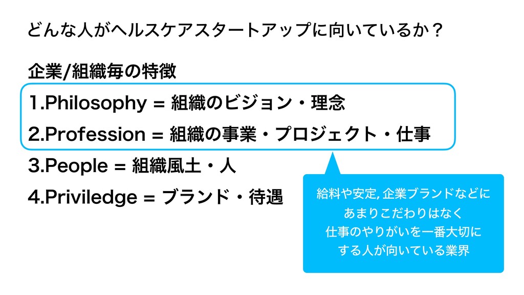 ͲΜͳਓ͕ϔϧεέΞελʔτΞοϓʹ͍͍ͯΔ͔ʁ اۀ৫ຖͷಛ 1IJMPTPQIZ৫ͷϏδϣϯɾཧ೦ 1SPGFTTJPO৫ͷࣄۀɾϓϩδΣΫτɾࣄ 1FPQMF৫෩ɾਓ 1SJWJMFEHFϒϥϯυɾ۰ څྉ҆ఆ, اۀϒϥϯυͳͲʹ ͋·Γͩ͜ΘΓͳ͘ ࣄͷΓ͕͍ΛҰ൪େʹ