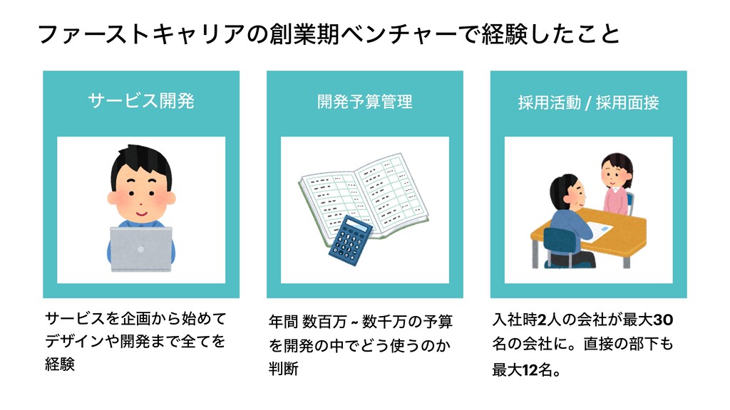ϑΝʔετΩϟϦΞͷۀظϕϯνϟʔͰܦݧͨ͜͠ͱ αʔϏε։ൃ ։ൃ༧ࢉཧ ࠾༻׆ಈ / ࠾༻໘ ೖࣾ࣌2ਓͷձ͕ࣾ࠷େ30 ໊ͷձࣾʹɻͷ෦Լ ࠷େ12໊ɻ ؒ