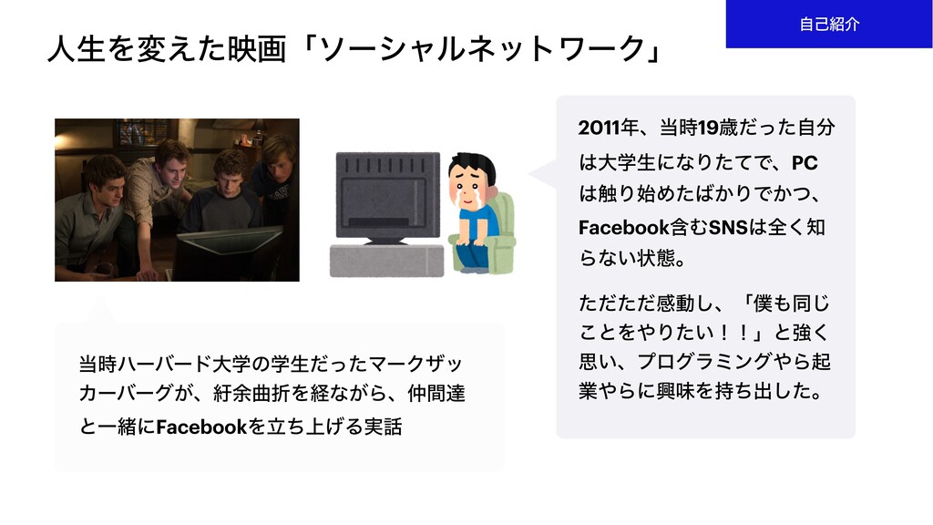 ਓੜΛม͑ͨөըʮιʔγϟϧωοτϫʔΫʯ ࣌ϋʔόʔυେֶͷֶੜͩͬͨϚʔΫβο Χʔόʔά͕ɺឯ༨ۂંΛܦͳ͕Βɺؒୡ ͱҰॹʹFacebookΛ্ཱͪ͛Δ࣮ 2011ɺ࣌19ࡀͩͬͨࣗ େֶੜʹͳΓͨͯͰɺPC ৮Γ࢝Ί͔ͨΓͰ͔ͭɺ FacebookؚΉSNSશ͘ Βͳ͍ঢ়ଶɻ ͨͩͨͩײಈ͠ɺʮಉ͡