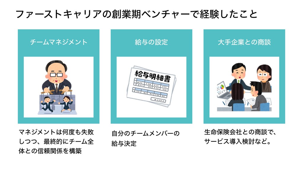 ϑΝʔετΩϟϦΞͷۀظϕϯνϟʔͰܦݧͨ͜͠ͱ νʔϜϚωδϝϯτ څ༩ͷઃఆ େखاۀͱͷஊ ϚωδϝϯτԿࣦഊ ͭͭ͠ɺ࠷ऴతʹνʔϜશ ମͱͷ৴པؔΛߏங ࣗͷνʔϜϝϯόʔͷ څ༩ܾఆ ੜ໋อݥձࣾͱͷஊͰɺ