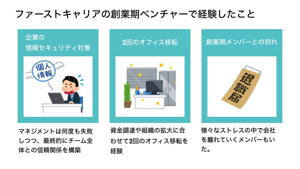 ϑΝʔετΩϟϦΞͷۀظϕϯνϟʔͰܦݧͨ͜͠ͱ اۀͷ ใηΩϡϦςΟରࡦ 2ճͷΦϑΟεҠస ۀظϝϯόʔͱͷผΕ ϚωδϝϯτԿࣦഊ ͭͭ͠ɺ࠷ऴతʹνʔϜશ ମͱͷ৴པؔΛߏங ࢿۚௐୡ৫ͷ֦େʹ߹ Θͤͯ2ճͷΦϑΟεҠసΛ