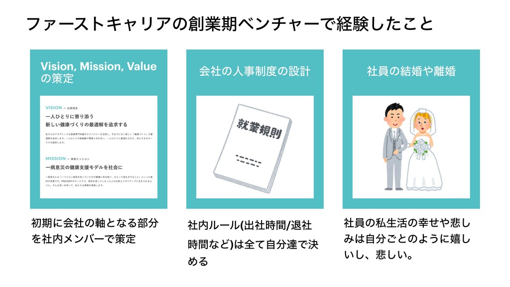 ϑΝʔετΩϟϦΞͷۀظϕϯνϟʔͰܦݧͨ͜͠ͱ Vision, Mission, Value ͷࡦఆ ձࣾͷਓࣄ੍ͷઃܭ ࣾһͷ݁ࠗࠗ ॳظʹձࣾͷ࣠ͱͳΔ෦ ΛࣾϝϯόʔͰࡦఆ ࣾϧʔϧ(ग़ࣾ࣌ؒ/ୀࣾ