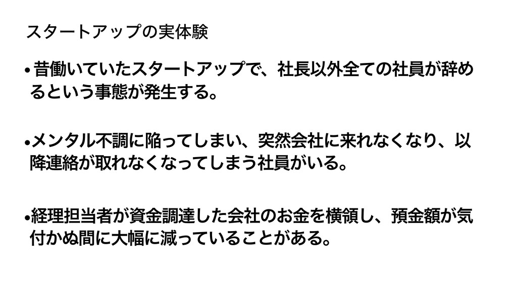 ελʔτΞοϓͷ࣮ମݧ • ੲಇ͍͍ͯͨελʔτΞοϓͰɺࣾҎ֎શͯͷࣾһ͕ࣙΊ Δͱ͍͏ࣄଶ͕ൃੜ͢Δɻ •ϝϯλϧෆௐʹؕͬͯ͠·͍ɺಥવձࣾʹདྷΕͳ͘ͳΓɺҎ ߱࿈བྷ͕औΕͳ͘ͳͬͯ͠·͏ࣾһ͕͍Δɻ •ܦཧ୲ऀ͕ࢿۚௐୡͨ͠ձࣾͷ͓ۚΛԣྖ͠ɺ༬ֹ͕ۚؾ ͔͵ؒʹେ෯ʹݮ͍ͬͯΔ͜ͱ͕͋Δɻ