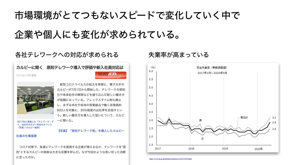 ࢢڥ͕ͱͯͭͳ͍εϐʔυͰมԽ͍ͯ͘͠தͰ اۀݸਓʹมԽ͕ٻΊΒΕ͍ͯΔɻ ֤ࣾςϨϫʔΫͷରԠ͕ٻΊΒΕΔ ࣦۀ͕ߴ·͍ͬͯΔ https://www.jil.go.jp/kokunai/statistics/covid-19/c06.html