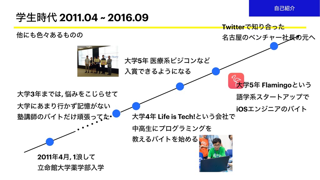 େֶʹ͋·Γߦ͔ͣهԱ͕ͳ͍ क़ߨࢣͷόΠτ͚ͩؤுͬͯͨ େֶ5 ҩྍܥϏδίϯͳͲ ೖͰ͖ΔΑ͏ʹͳΔ େֶ4 Life is Tech!ͱ͍͏ձࣾͰ தߴੜʹϓϩάϥϛϯάΛ ڭ͑ΔόΠτΛ࢝ΊΔ TwitterͰΓ߹ͬͨ ໊ݹͷϕϯνϟʔࣾͷݩ େֶ5 Flamingoͱ͍͏ ޠֶܥελʔτΞοϓͰ iOSΤϯδχΞͷόΠτ ଞʹ৭ʑ͋Δͷͷ