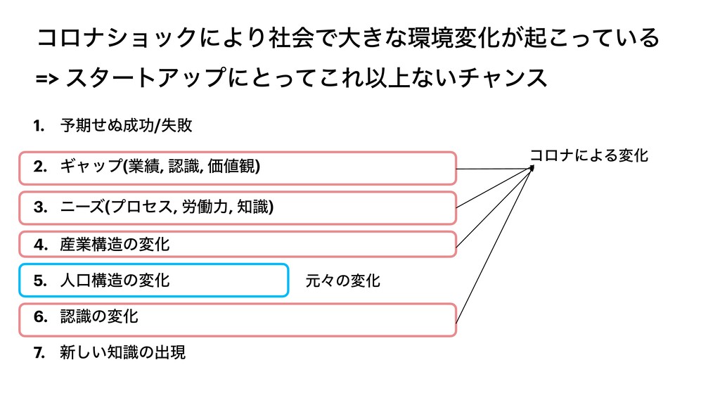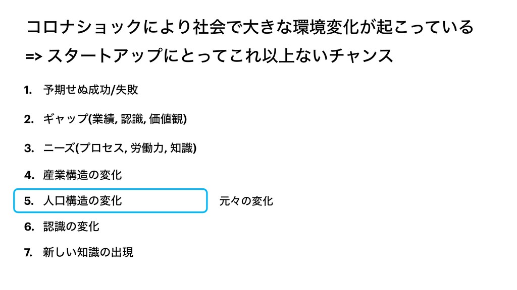 χʔζ(ϓϩηε, ࿑ಇྗ, ࣝ) 4. ࢈ۀߏͷมԽ 5. ਓޱߏͷมԽ 6. ೝࣝͷมԽ 7. ৽͍ࣝ͠ͷग़ݱ ݩʑͷมԽ ίϩφʹΑΔมԽ