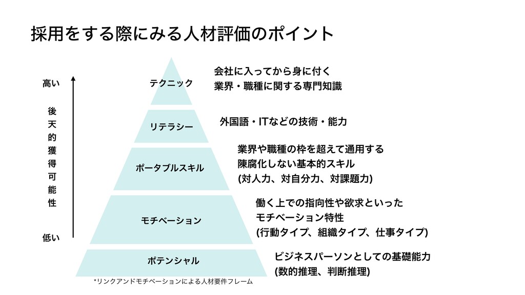 Մ ೳ ੑ ߴ͍ ͍ ձࣾʹೖ͔ͬͯΒʹ͘ ۀքɾ৬छʹؔ͢Δઐࣝ ֎ࠃޠɾ*5ͳͲͷٕज़ɾೳྗ ۀք৬छͷΛ͑ͯ௨༻͢Δ Խ͠ͳ͍جຊతεΩϧ ରਓྗɺରࣗྗɺର՝ྗ ಇ্͘Ͱͷࢦੑཉٻͱ͍ͬͨ Ϟνϕʔγϣϯಛੑ ߦಈλΠϓɺ৫λΠϓɺࣄλΠϓ Ϗδωεύʔιϯͱͯ͠ͷجૅೳྗ తਪཧɺஅਪཧ *ϦϯΫΞϯυϞνϕʔγϣϯʹΑΔਓࡐཁ݅ϑϨʔϜ ࠾༻Λ͢ΔࡍʹΈΔਓࡐධՁͷϙΠϯτ