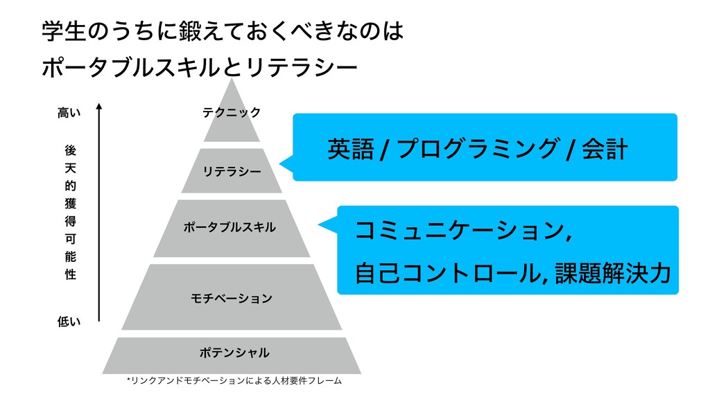 ೳ ੑ ߴ͍ ͍ *ϦϯΫΞϯυϞνϕʔγϣϯʹΑΔਓࡐཁ݅ϑϨʔϜ ֶੜͷ͏ͪʹ͓͖͑ͯ͘ͳͷ ϙʔλϒϧεΩϧͱϦςϥγʔ ςΫχοΫ ӳޠ / ϓϩάϥϛϯά / ձܭ ίϛϡχέʔγϣϯ, ࣗݾίϯτϩʔϧ, ՝ղܾྗ