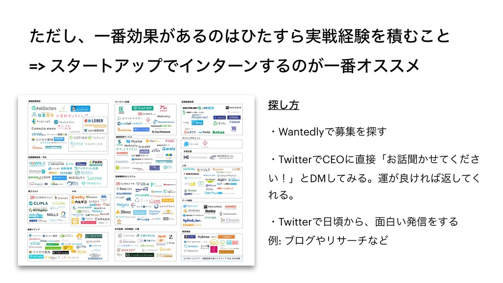 ͨͩ͠ɺҰ൪ޮՌ͕͋Δͷͻͨ͢Β࣮ઓܦݧΛੵΉ͜ͱ => ελʔτΞοϓͰΠϯλʔϯ͢Δͷ͕Ұ൪Φεεϝ ୳͠ํ ɾWantedlyͰืूΛ୳͢ ɾTwitterͰCEOʹʮ͓ฉ͔ͤͯͩ͘͞ ͍ʂʯͱDMͯ͠ΈΔɻӡ͕ྑ͚Εฦͯ͘͠ ΕΔɻ ɾTwitterͰࠒ͔Βɺ໘ന͍ൃ৴Λ͢Δ ྫ: