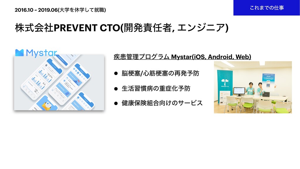 2016.10 ~ 2019.06(େֶΛٳֶͯ͠ब৬) גࣜձࣾPREVENT CTO(։ൃऀ, ΤϯδχΞ) ͜Ε·Ͱͷࣄ ࣬ױཧϓϩάϥϜ Mystar(iOS, Android,