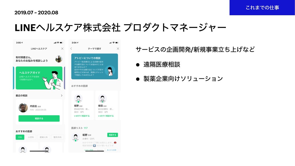 2019.07 ~ 2020.08 LINEϔϧεέΞגࣜձࣾ ϓϩμΫτϚωʔδϟʔ ͜Ε·Ͱͷࣄ αʔϏεͷاը։ൃ/৽نࣄۀ্ཱͪ͛ͳͲ • ԕִҩྍ૬ஊ •