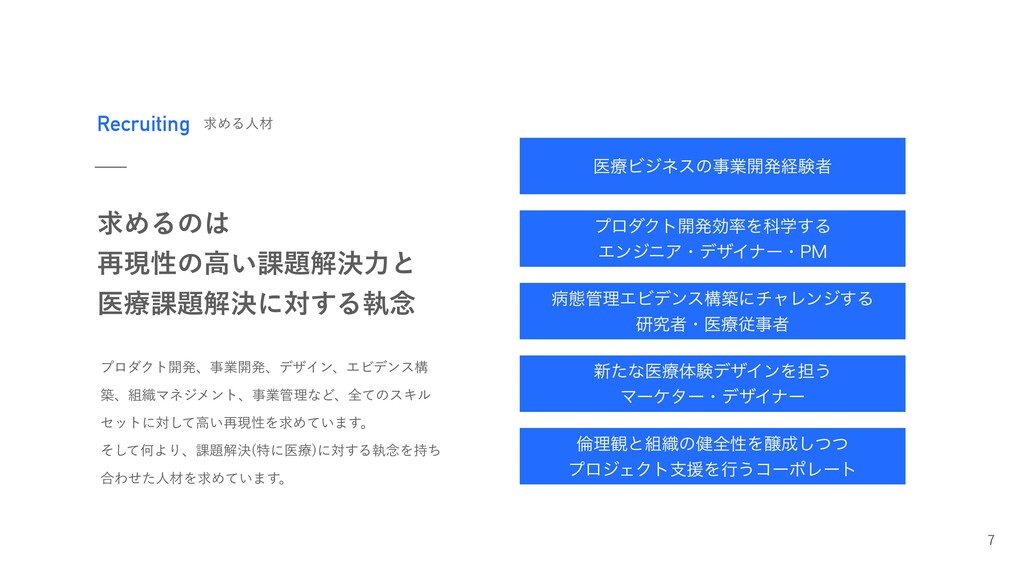 ʹର͢Δࣥ೦Λ࣋ͪ ߹ΘͤͨਓࡐΛٻΊ͍ͯ·͢ɻ ҩྍϏδωεͷࣄۀ։ൃܦݧऀ ϓϩμΫτ։ൃޮΛՊֶ͢Δ ΤϯδχΞɾσβΠφʔɾ1. පଶཧΤϏσϯεߏஙʹνϟϨϯδ͢Δ ݚڀऀɾҩྍैࣄऀ ৽ͨͳҩྍମݧσβΠϯΛ୲͏ ϚʔέλʔɾσβΠφʔ ྙཧ؍ͱ৫ͷ݈શੑΛৢͭͭ͠ ϓϩδΣΫτࢧԉΛߦ͏ίʔϙϨʔτ