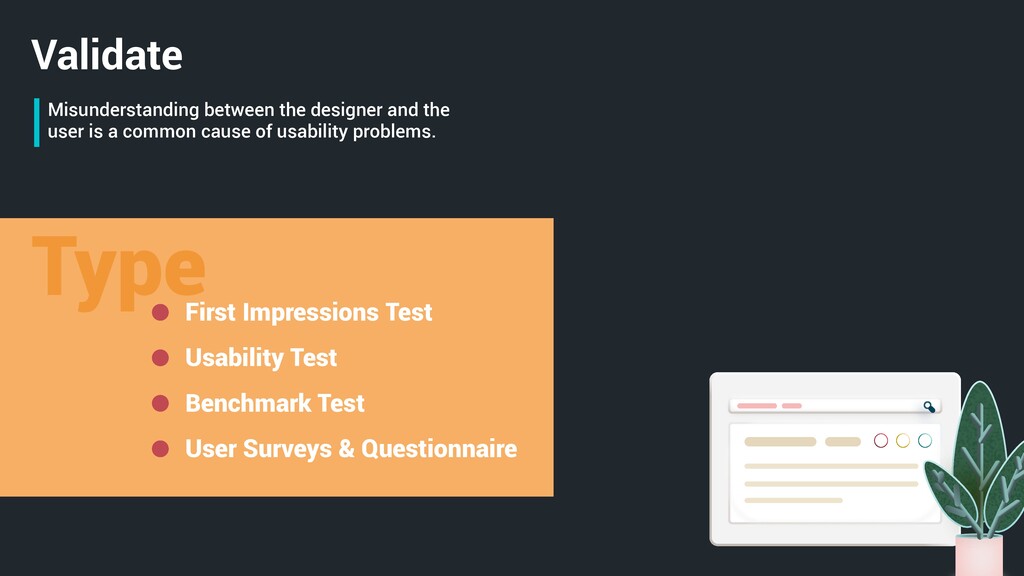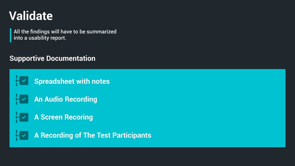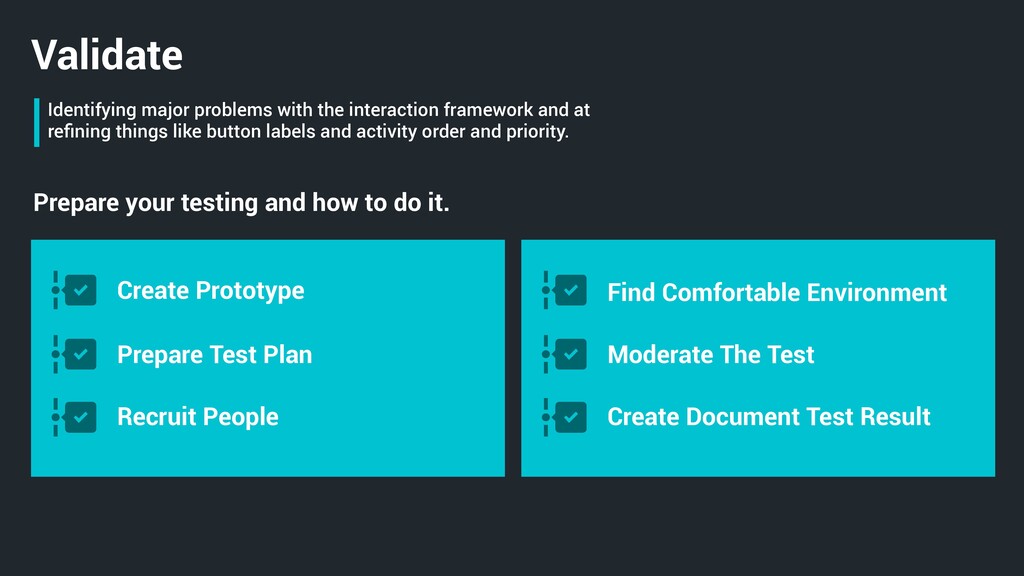 things like button labels and activity order and priority. Prepare your testing and how to do it. Create Prototype Prepare Test Plan Recruit People Find Comfortable Environment Moderate The Test Create Document Test Result Validate