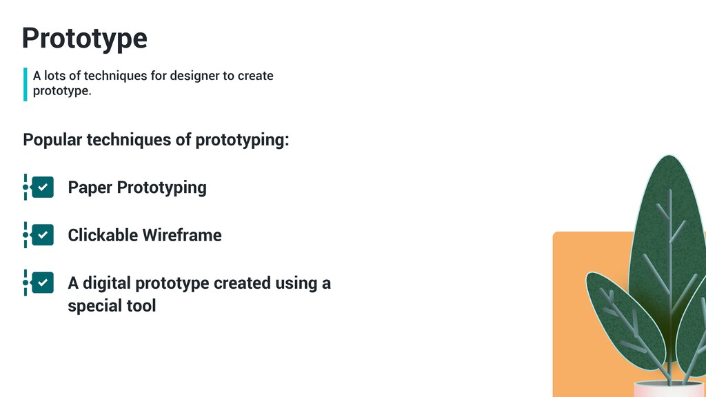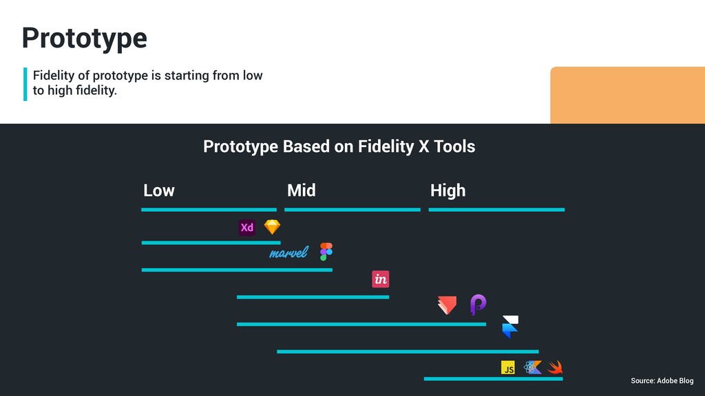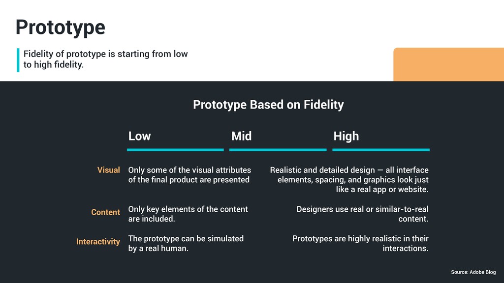 Prototype Prototype Based on Fidelity Low Visual Content Interactivity Mid High Only some of the visual attributes of the final product are presented Only key elements of the content are included. Realistic and detailed design — all interface elements, spacing, and graphics look just like a real app or website. Designers use real or similar-to-real content. Prototypes are highly realistic in their interactions. The prototype can be simulated by a real human. Source: Adobe Blog