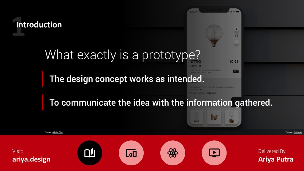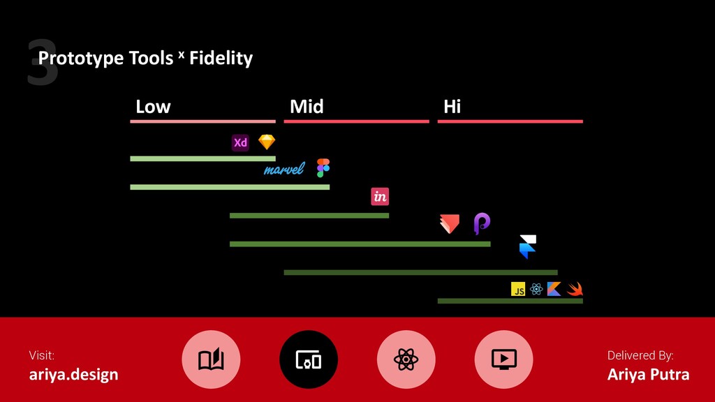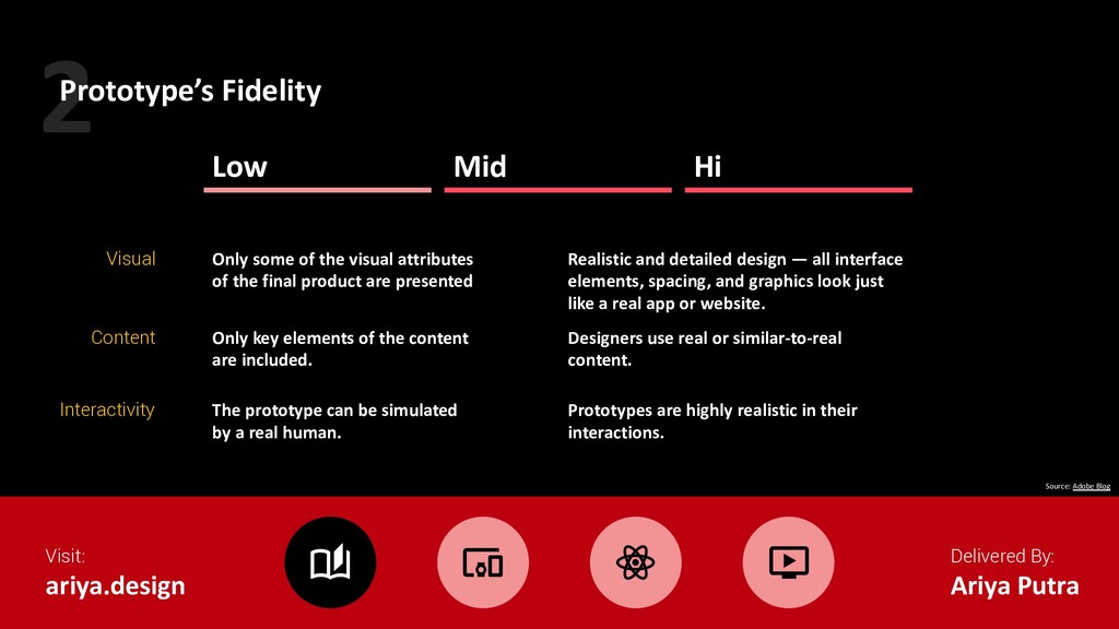 Mid Hi Visual Content Interactivity Only some of the visual attributes of the final product are presented Only key elements of the content are included. The prototype can be simulated by a real human. Realistic and detailed design — all interface elements, spacing, and graphics look just like a real app or website. Designers use real or similar-to-real content. Prototypes are highly realistic in their interactions. Source: Adobe Blog