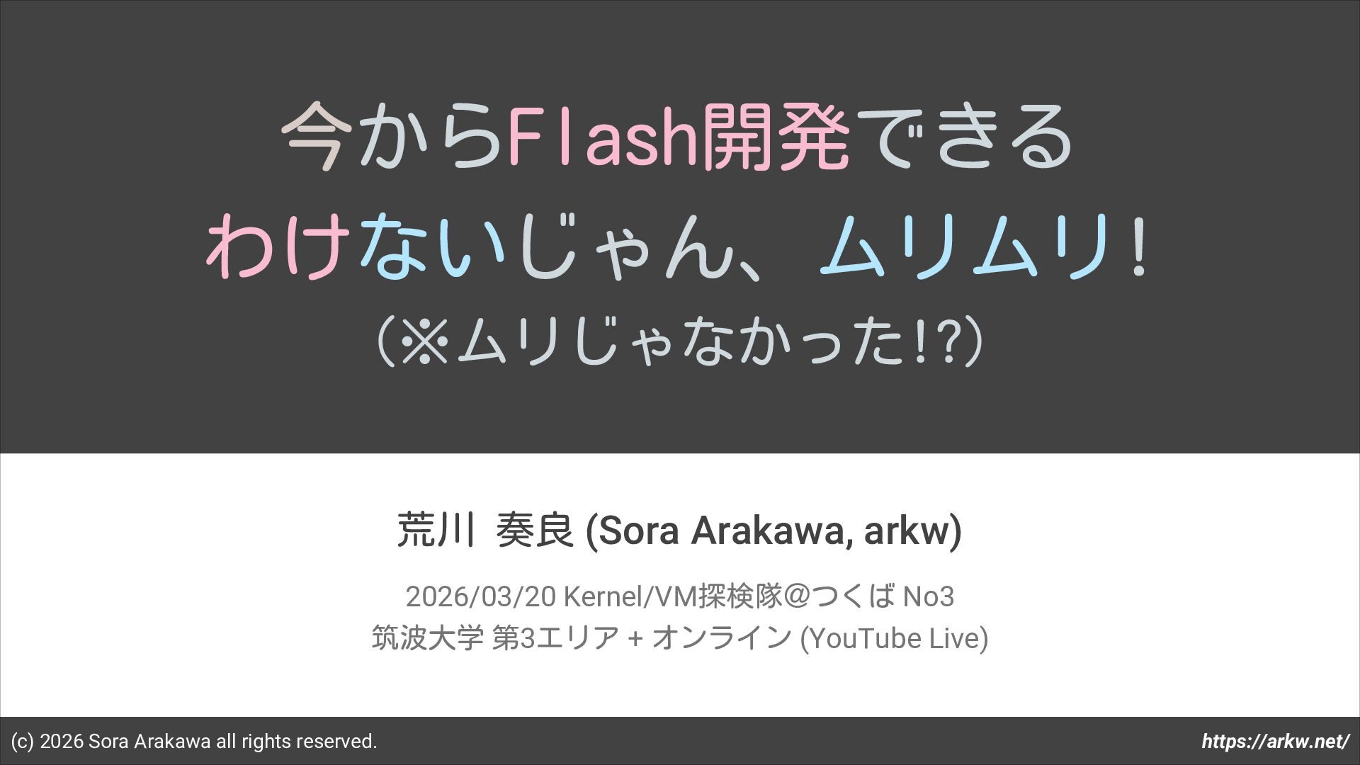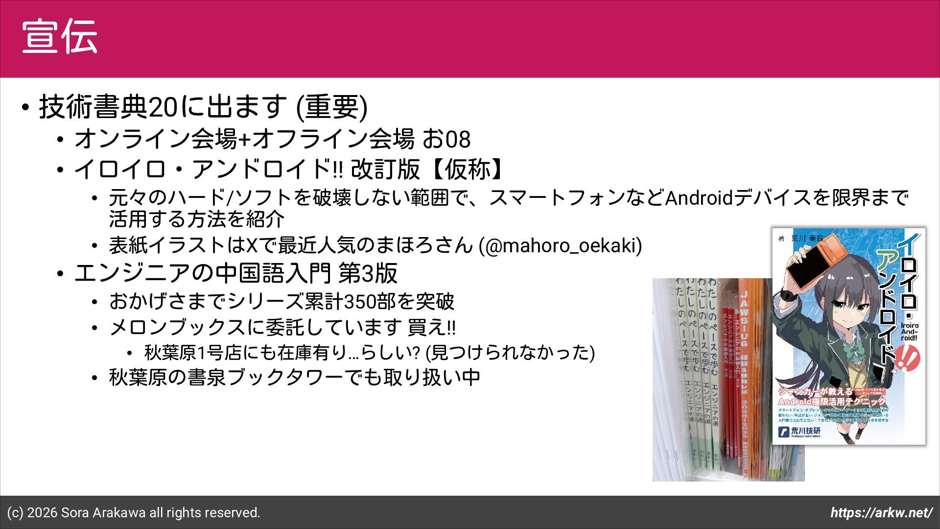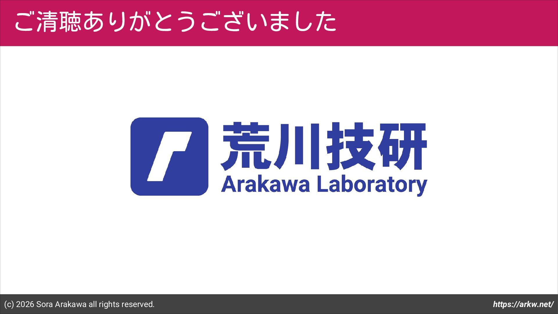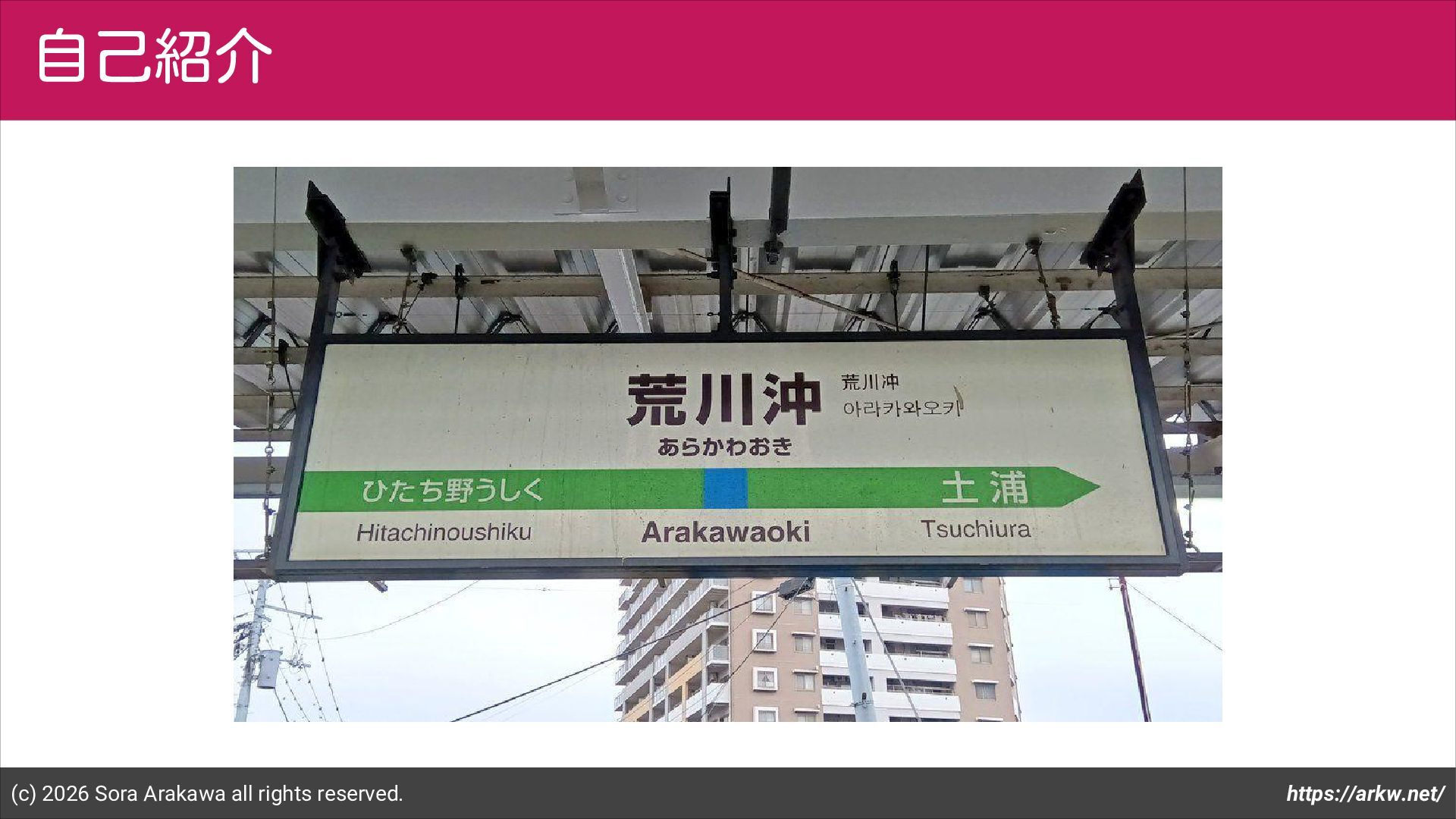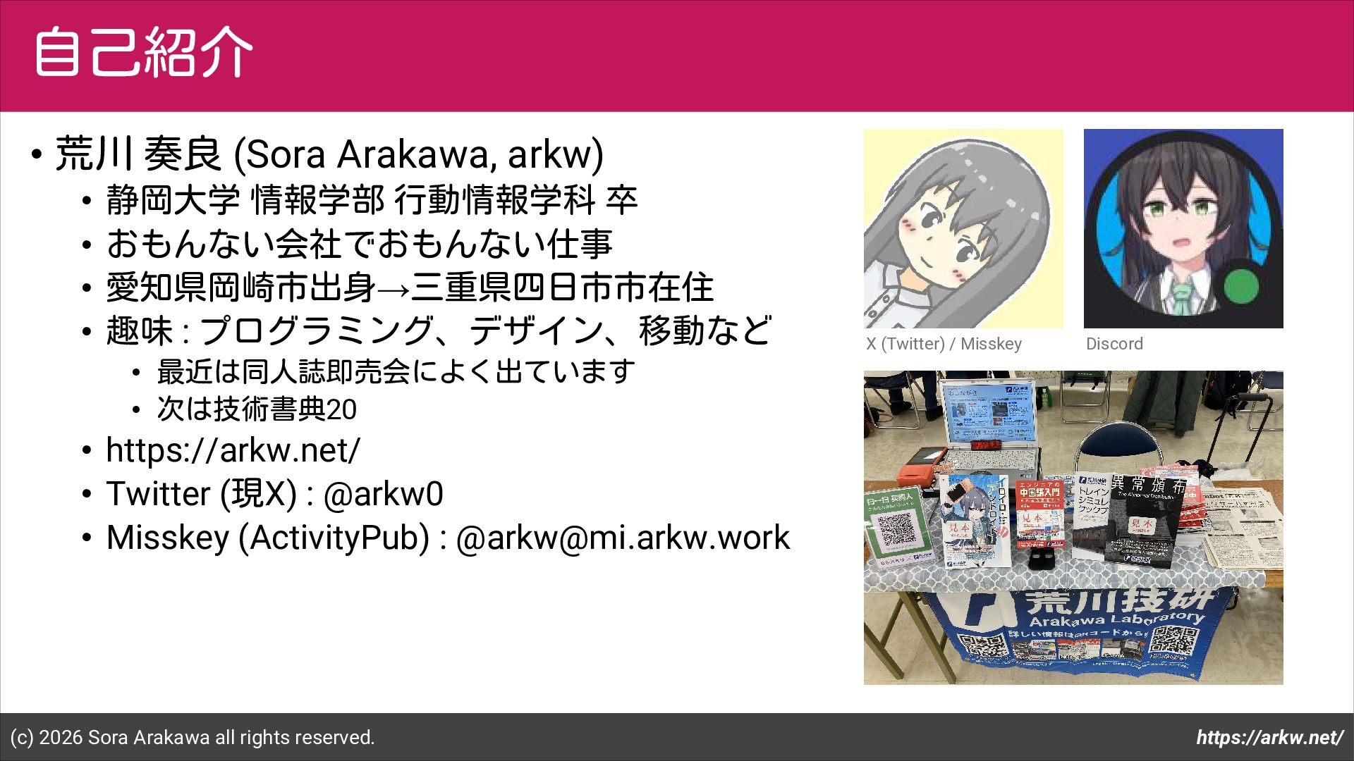荒川 奏良 (Sora Arakawa, arkw) • 静岡大学 情報学部 行動情報学科 卒 • おもんない会社でおもんない仕事 • 愛知県岡崎市出身→三重県四日市市在住 • 趣味 : プログラミング、デザイン、移動など • 最近は同人誌即売会によく出ています • 次は技術書典20 • https://arkw.net/ • Twitter (現X) : @arkw0 • Misskey (ActivityPub) : @