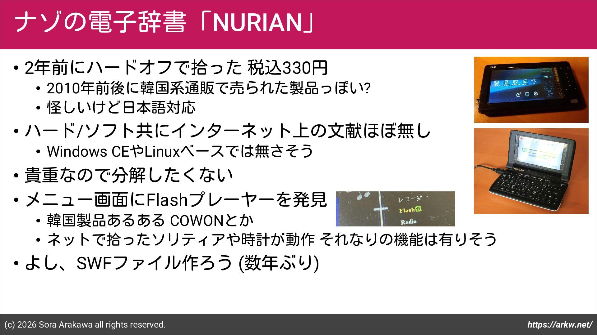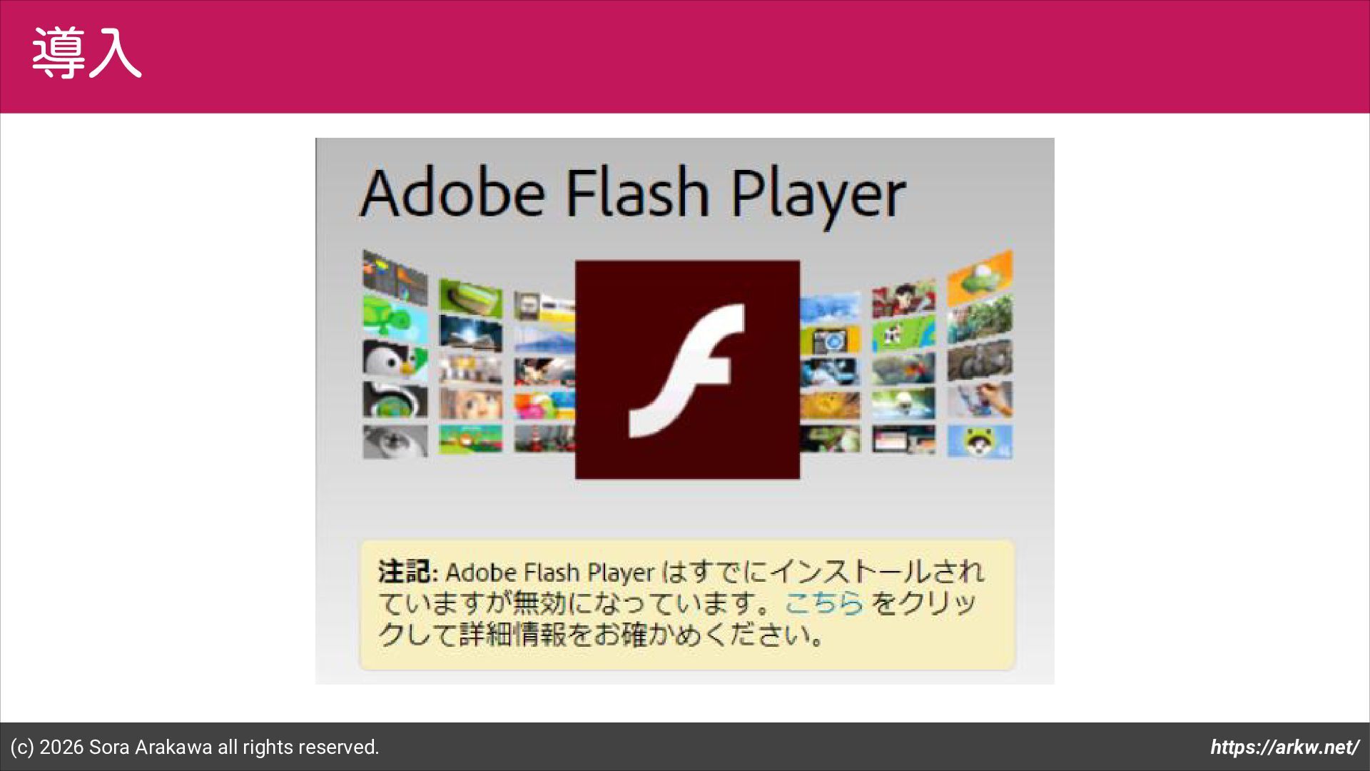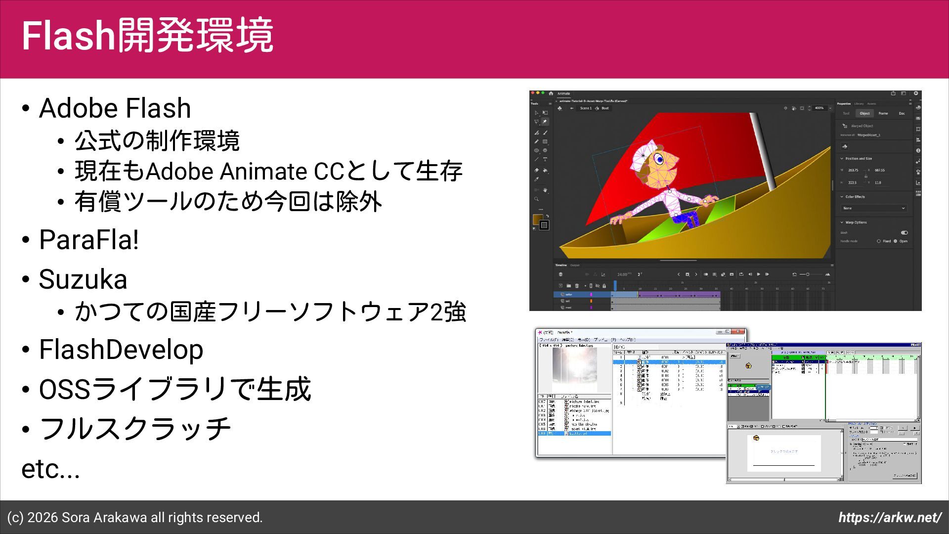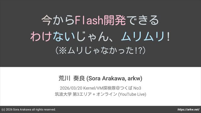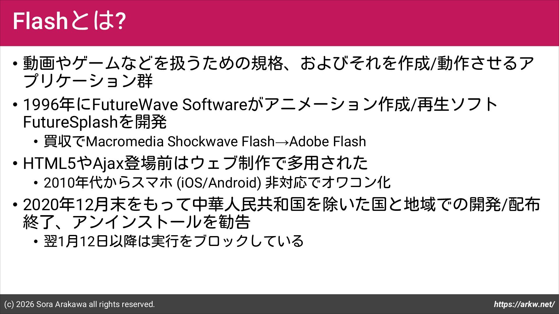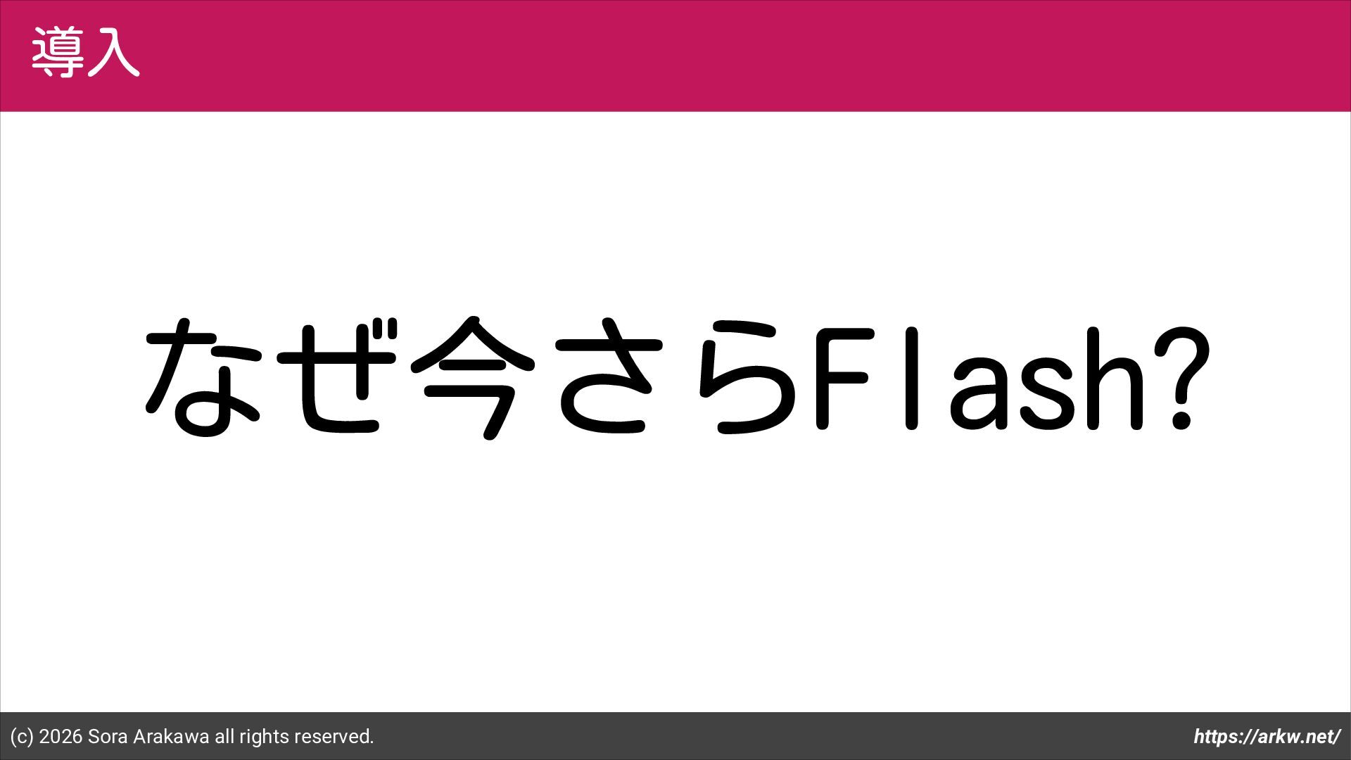 荒川 奏良 (Sora Arakawa, arkw) • 静岡大学 情報学部 行動情報学科 卒 • おもんない会社でおもんない仕事 • 愛知県岡崎市出身→三重県四日市市在住 • 趣味 : プログラミング、デザイン、移動など • 最近は同人誌即売会によく出ています • 次は技術書典20 • https://arkw.net/ • Twitter (現X) : @arkw0 • Misskey (ActivityPub) : @
