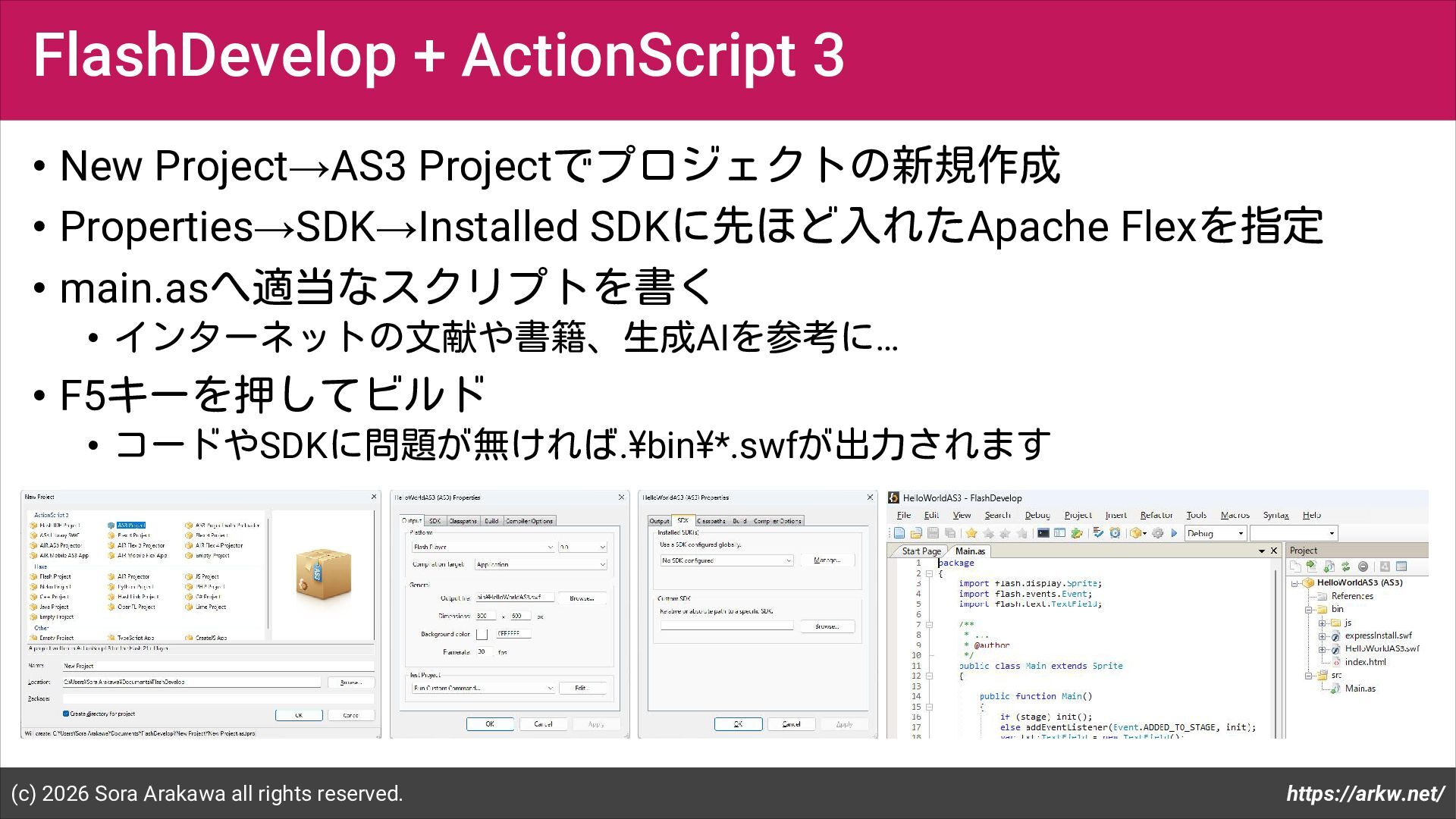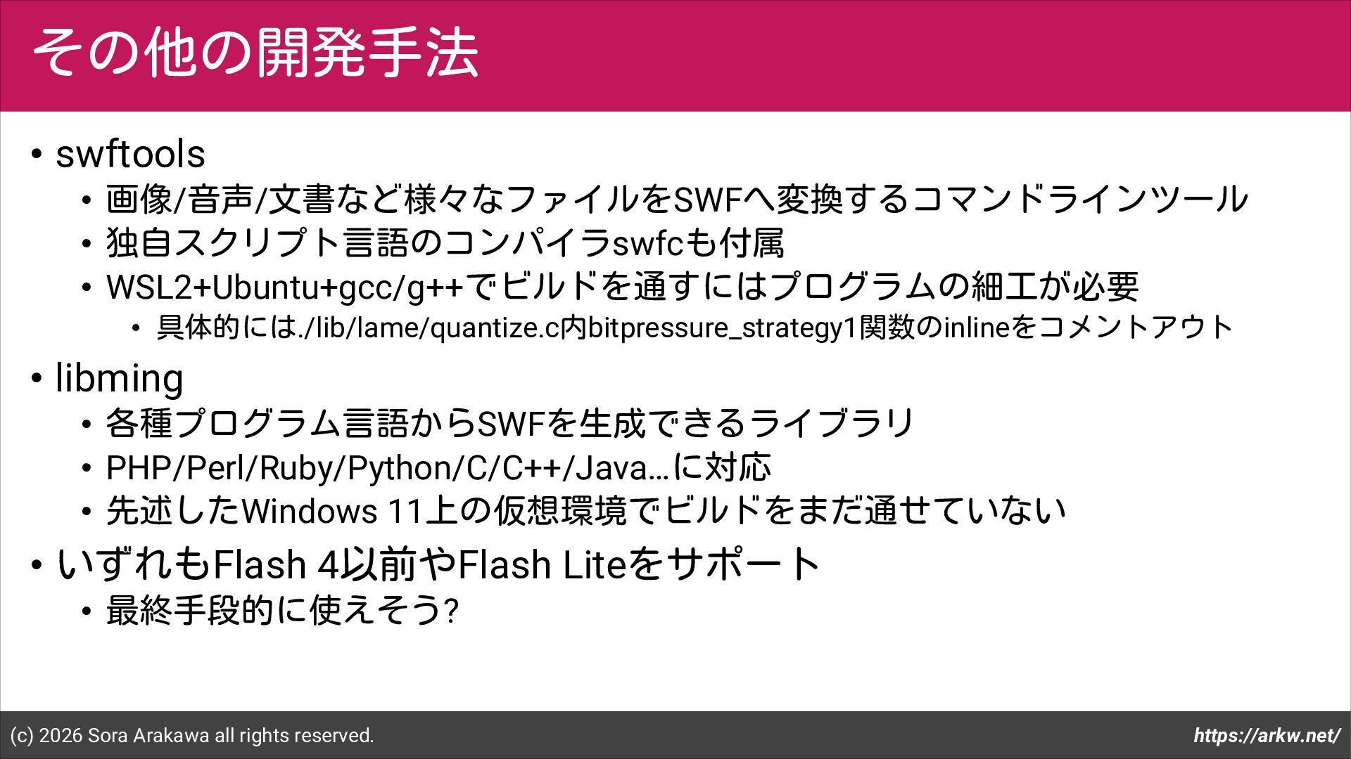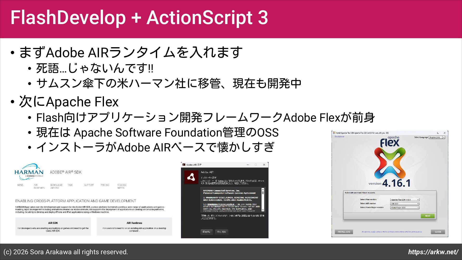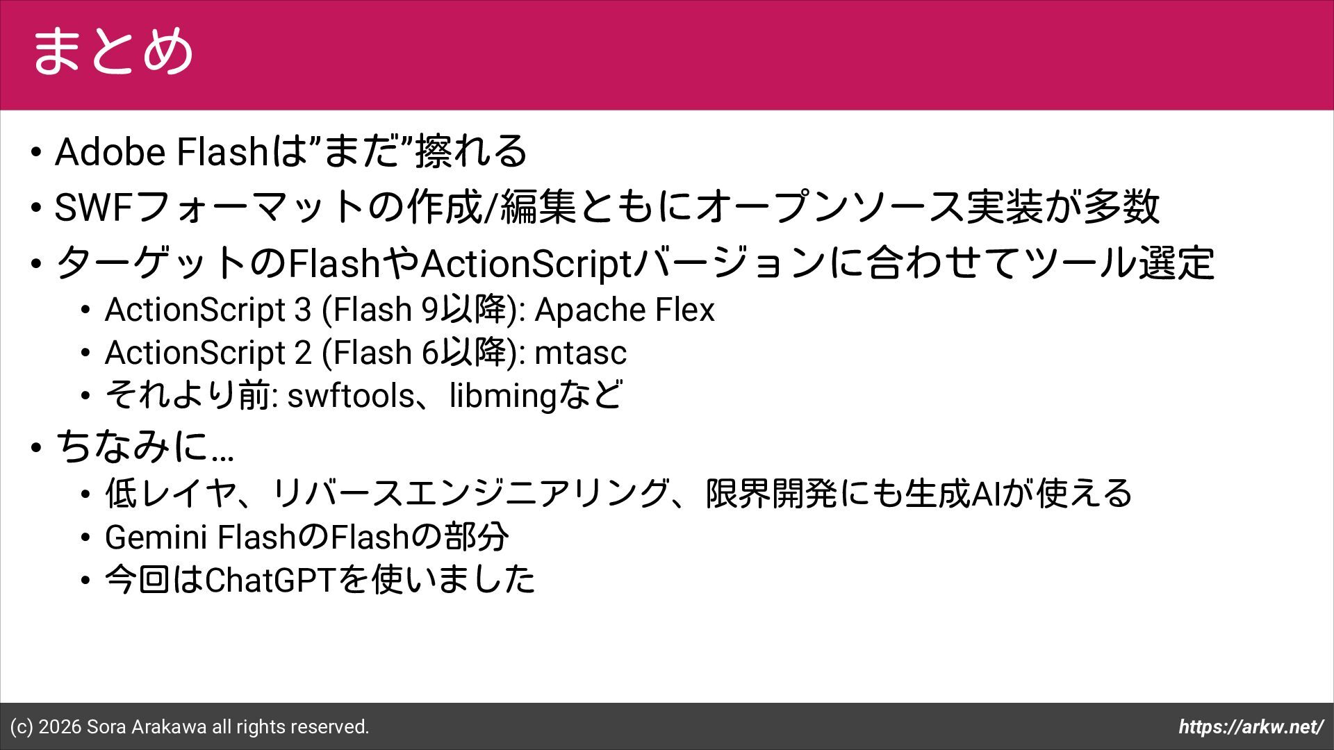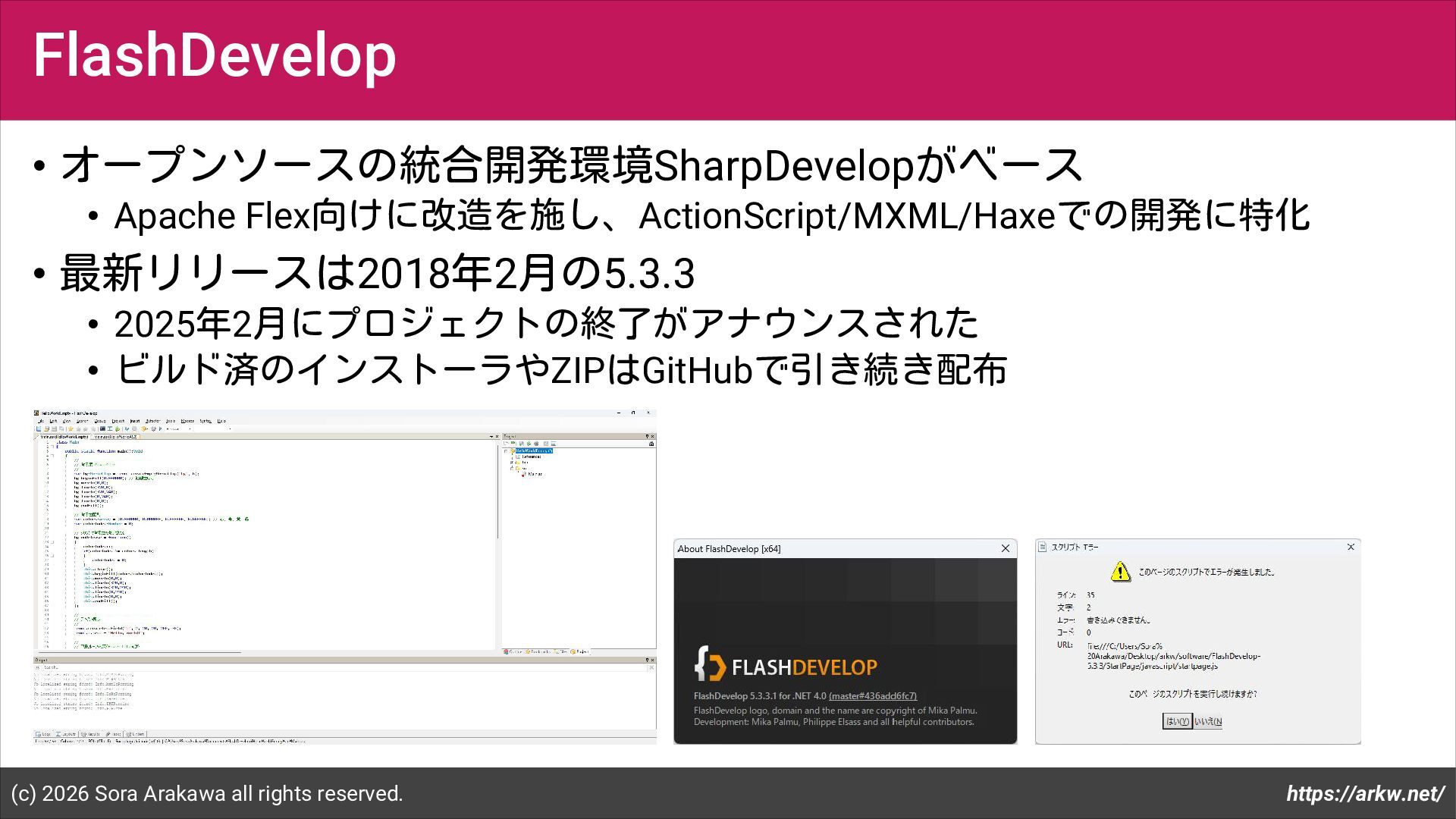 荒川 奏良 (Sora Arakawa, arkw) • 静岡大学 情報学部 行動情報学科 卒 • おもんない会社でおもんない仕事 • 愛知県岡崎市出身→三重県四日市市在住 • 趣味 : プログラミング、デザイン、移動など • 最近は同人誌即売会によく出ています • 次は技術書典20 • https://arkw.net/ • Twitter (現X) : @arkw0 • Misskey (ActivityPub) : @
