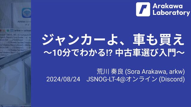 ジャンカーよ、車も買え ~10分でわかる!? 中古車選び入門~ 荒川 奏良 (Sora Arakawa, arkw) 2024/08/24 JSNOG-LT-4@オンライン (Discord)